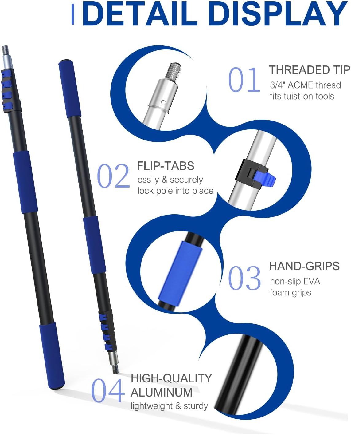 - Durable & Extendable Pole - Reach new heights safely with our 5–20 ft telescopic tree pruner pole. Made of high-quality aluminum, this telescoping pole is extremely sturdy and durable, featuring a universal 3/4-inch threaded tip compatible with all SKGPOLE attachments. Extension Pole includes two non-slip foam handles for a secure grip and four flap locks for easy length adjustment. Ideal for long reach tree trimming without a ladder.
