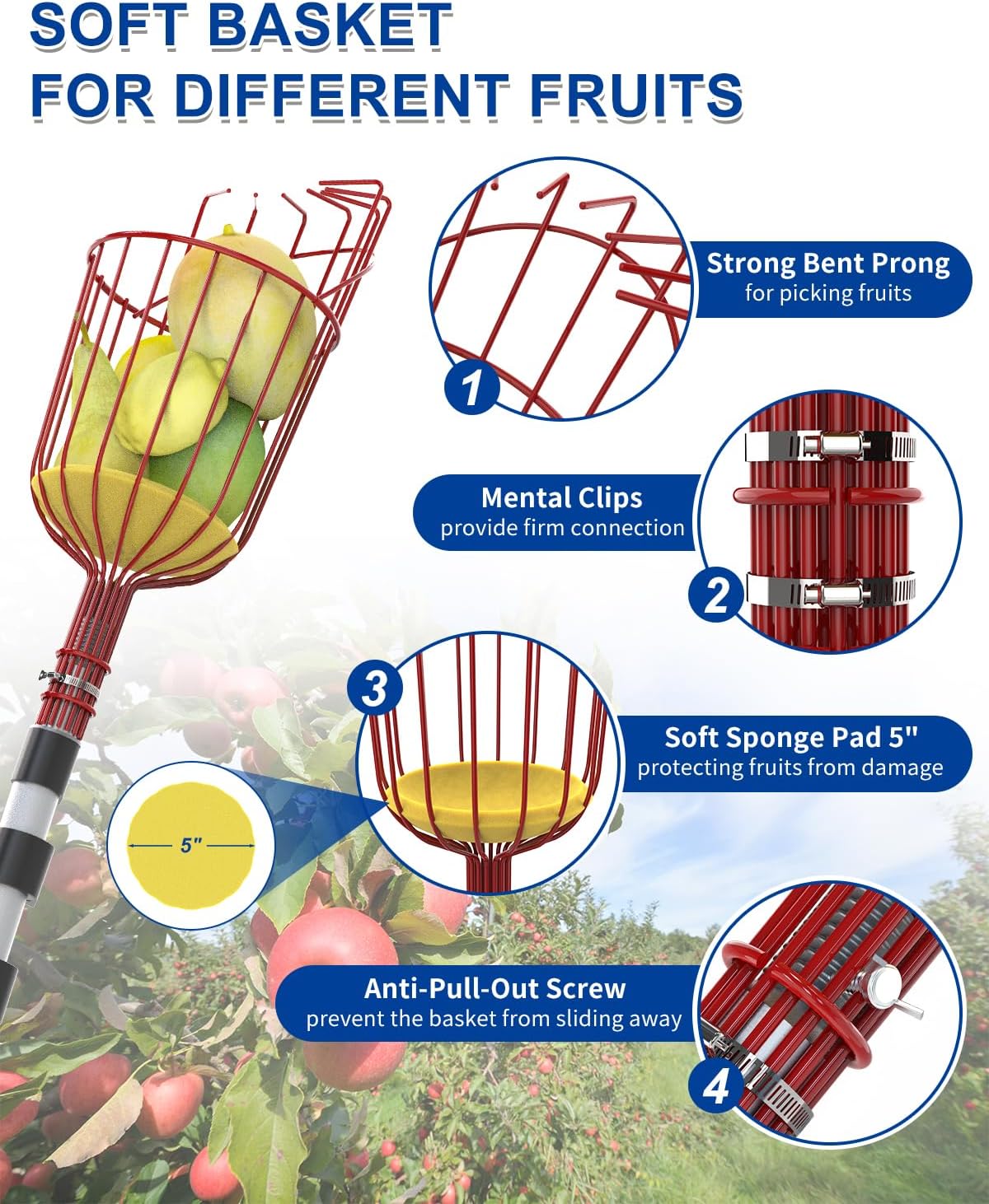 - Fruit Picker Foam Pad Protection - The fruit picker tool is equipped with a large capacity metal basket with a diameter of 5.5 inches, including an ultra thick elastic foam pad. The apple picker pole with basket can accommodate multiple fruits, ensuring that the picked fruits fall on a soft surface, protecting each piece of fruit from damage or scratches. Perfect for picking fruit such as apple, orange, avocado, apricot, mango, lemon, pears, plums, and more!