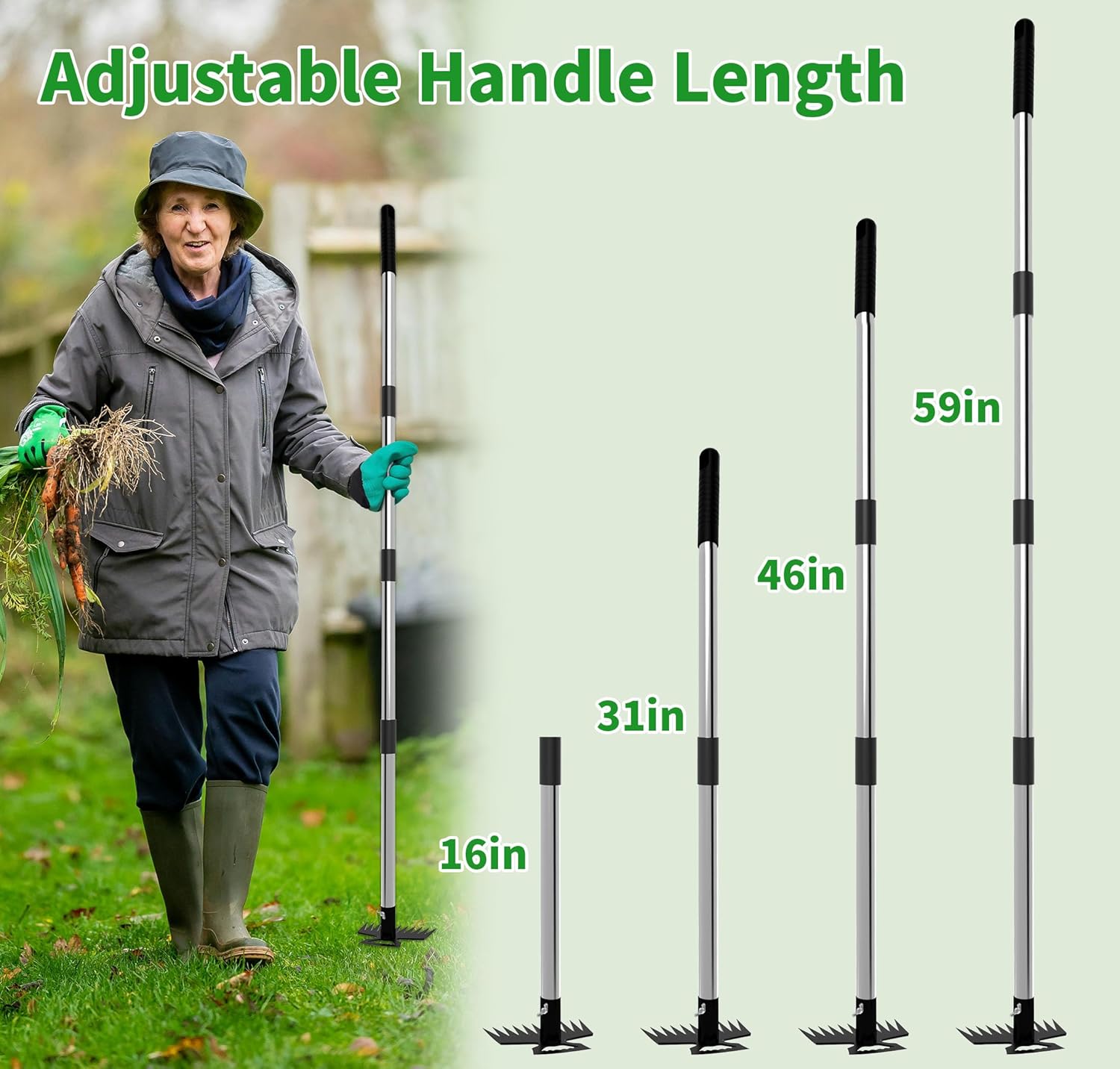 - 【59" Extended Handle】 Crafted from durable stainless steel, this long-handle weed remover lets you work upright—no bending or kneeling needed. Ideal for reducing strain, especially for those with back problems