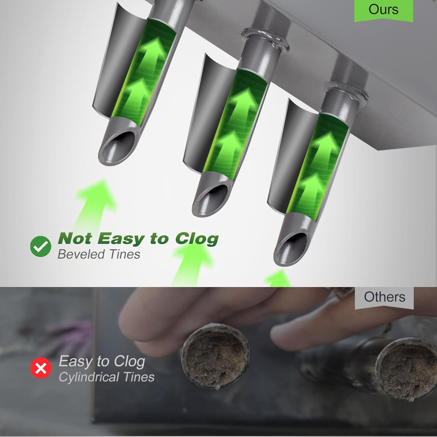 - 3 Special Coring Tines: Walensee lawn plug aerator is equipped with 3 tines featuring a tapered, beveled round tube design. The diameter gradually increases from small to large, followed by a straight tube, allowing the tool to smoothly penetrate the soil up to 4 inches and reduce the risk of clogging. This design also helps expel any old soil trapped inside the tube when the aerator is pulled out, ensuring both old and new soil are efficiently removed for a cleaner, more effective aeration.