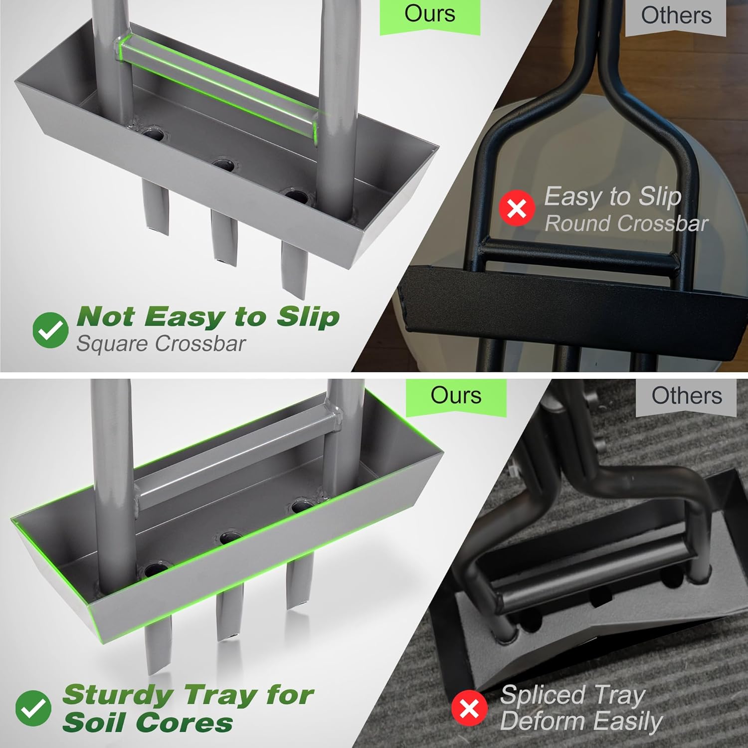 - Sturdy and Durable Structure: The lawn coring aerator is expertly crafted from high-quality painted metal, ensuring long-lasting durability and reliable performance while being rust-resistant for extra longevity. In addition, the tray which made from a single sheet of metal positioned 3.2 inches above the foot space, preventing accidental bending from stepping on the edges. This design enhances the overall strength and stability, making it ideal for frequent lawn care tasks.