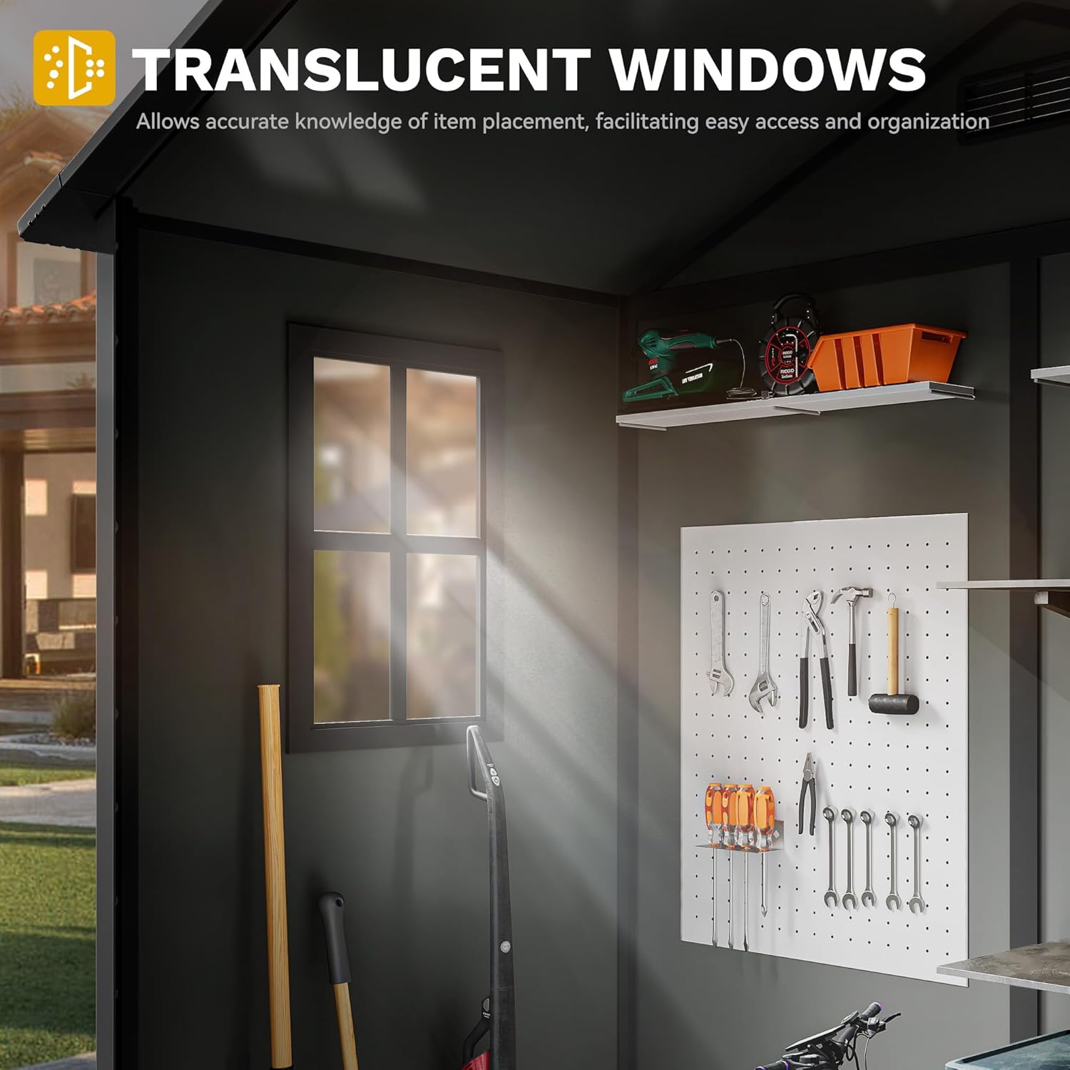 - [Heavy-Duty Floor] The backyard storage shed features a 12mm thick double-wall resin floor that adds extra protection to ensure stored items remain clean and dry; The durable PVC floor is wear-resistant and capable of supporting heavy equipment, enhancing the stability of the flat surface
