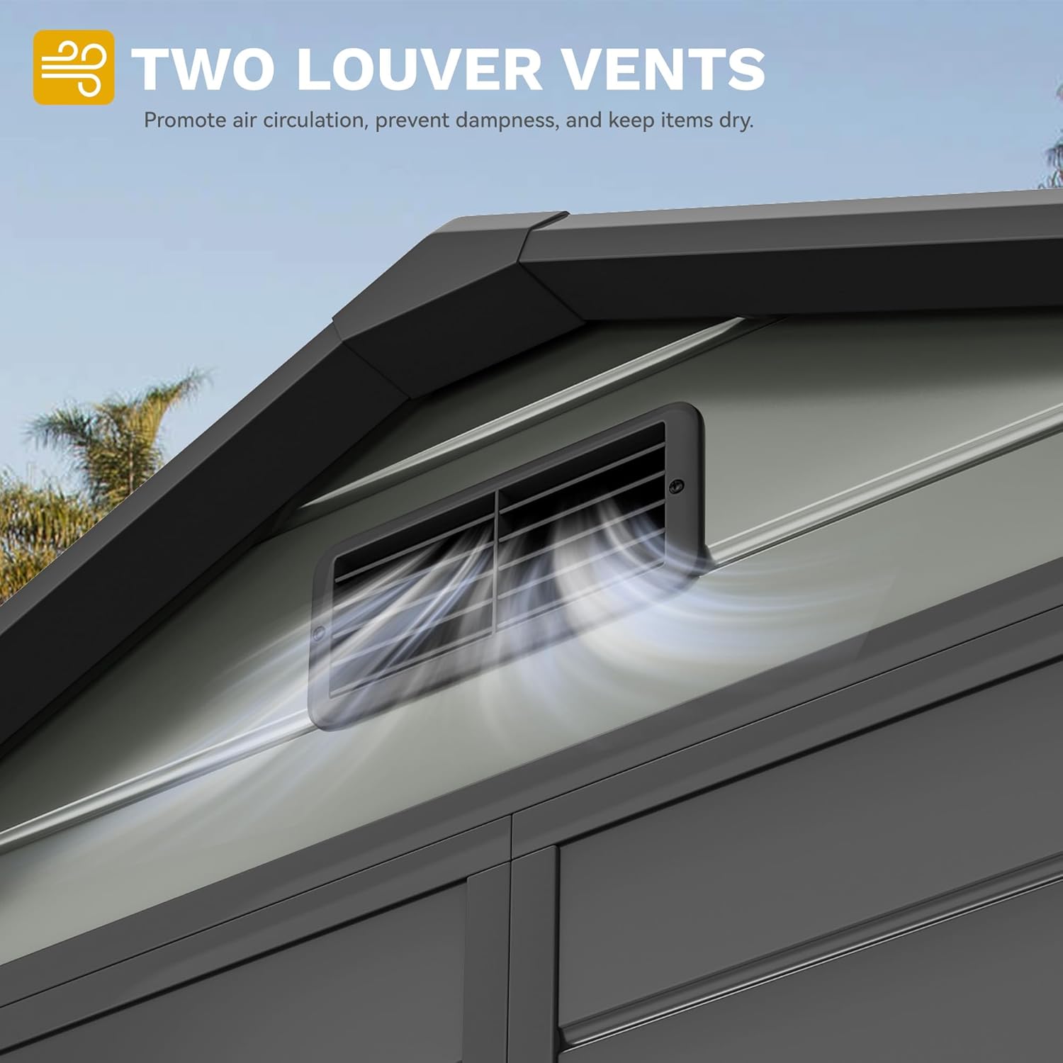 - [Optimal Ventilation & Transparency] The garden tool storage features a lockable door that prevents theft and protects stored items; The transparent side windows allow natural light to illuminate the interior, while the louvered vents promote air circulation and prevent moisture buildup; The sloped roof facilitates drainage, prevents rainwater accumulation and extends the shedβs lifespan