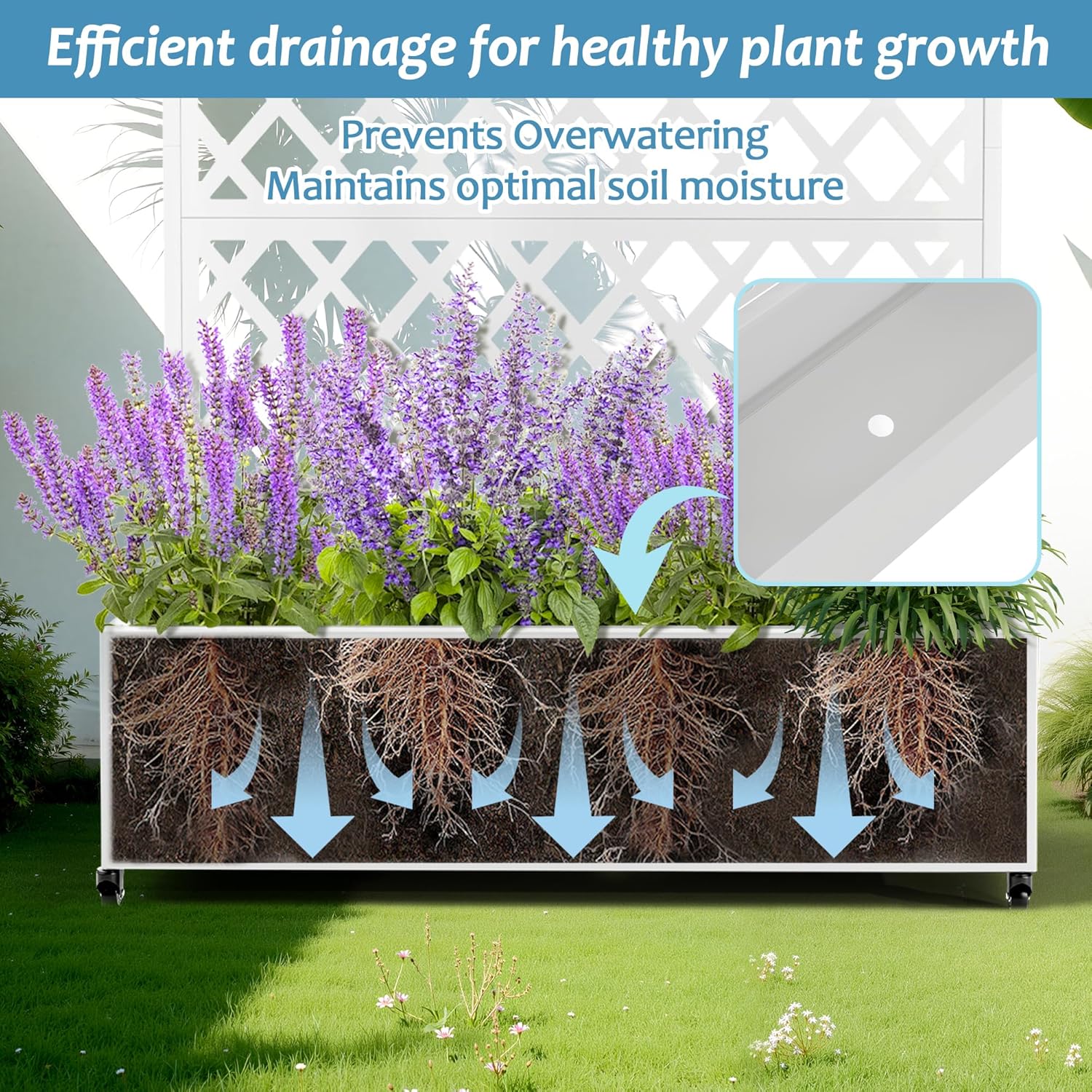 Metal Planter Box with Trellis & Wheels, Raised Garden Bed with Privacy Screen, Outdoor Standing Flower Beds with Drainage Hole for Climbing Plants, Vine, 35.4" L x 15.7" W x 70.9" H, White