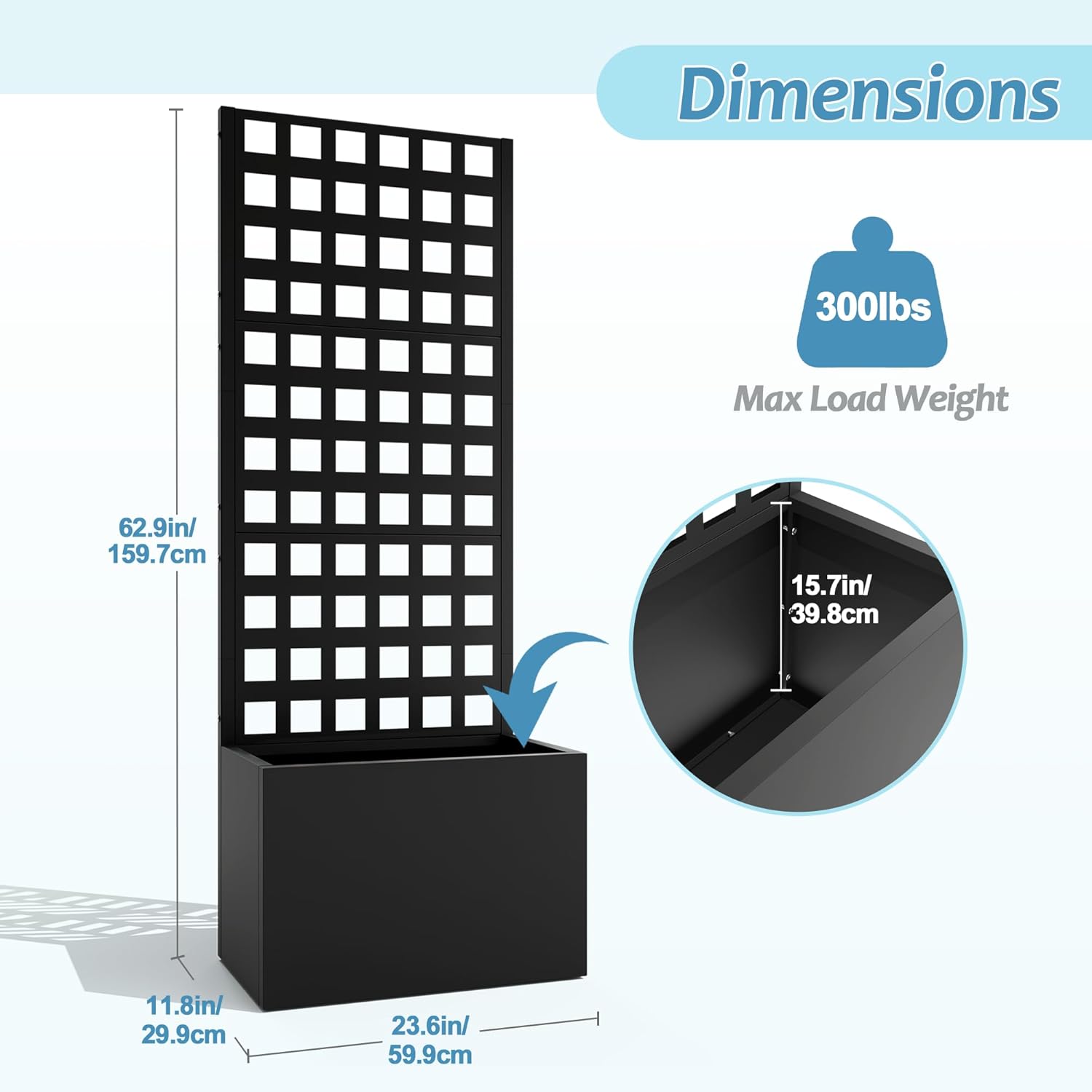 Metal Planter Box with Trellis, Raised Garden Bed with Privacy Screen, Outdoor Standing Flower Beds with Drainage Hole for Climbing Plants, Vine, 23" L x 12" W x 63" H, Black
