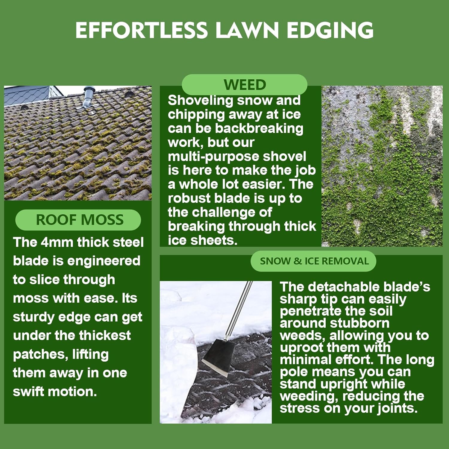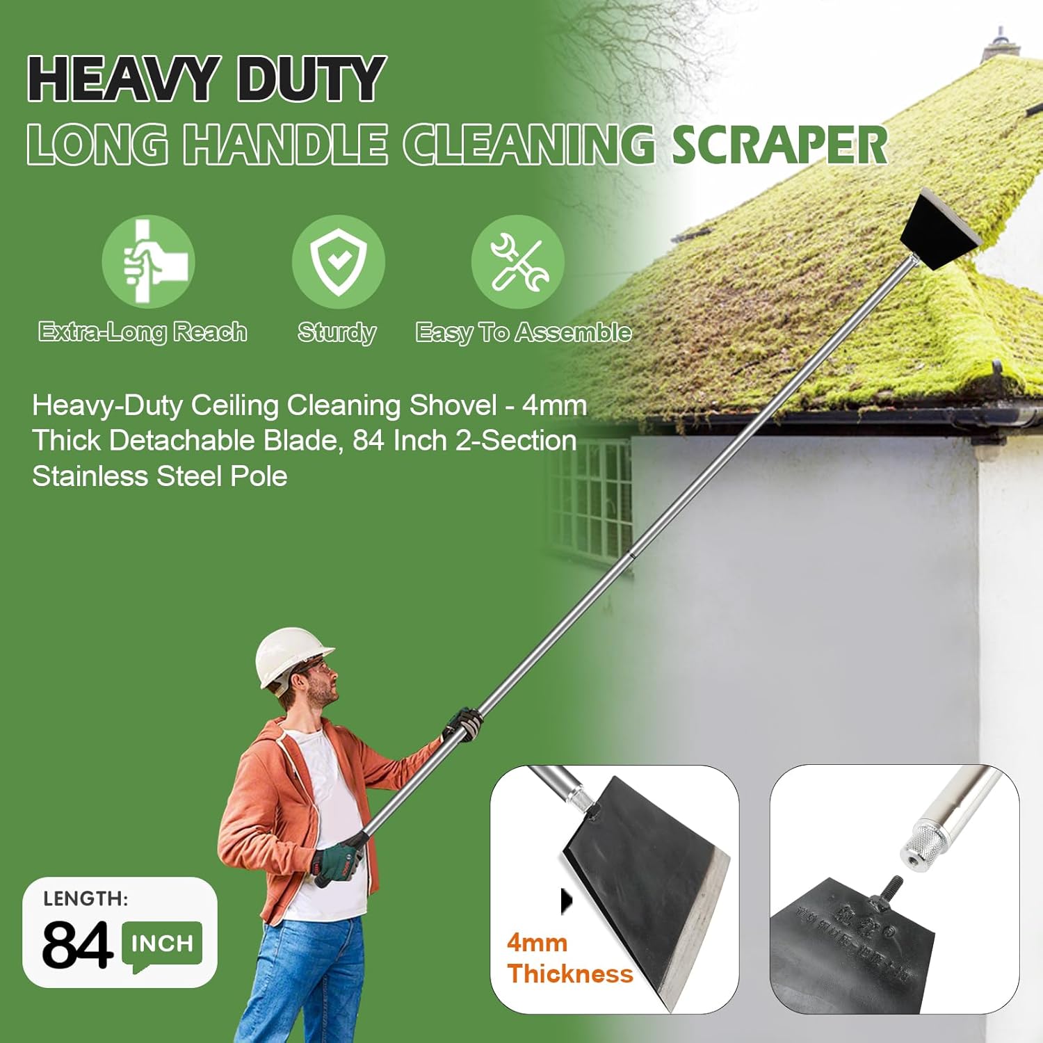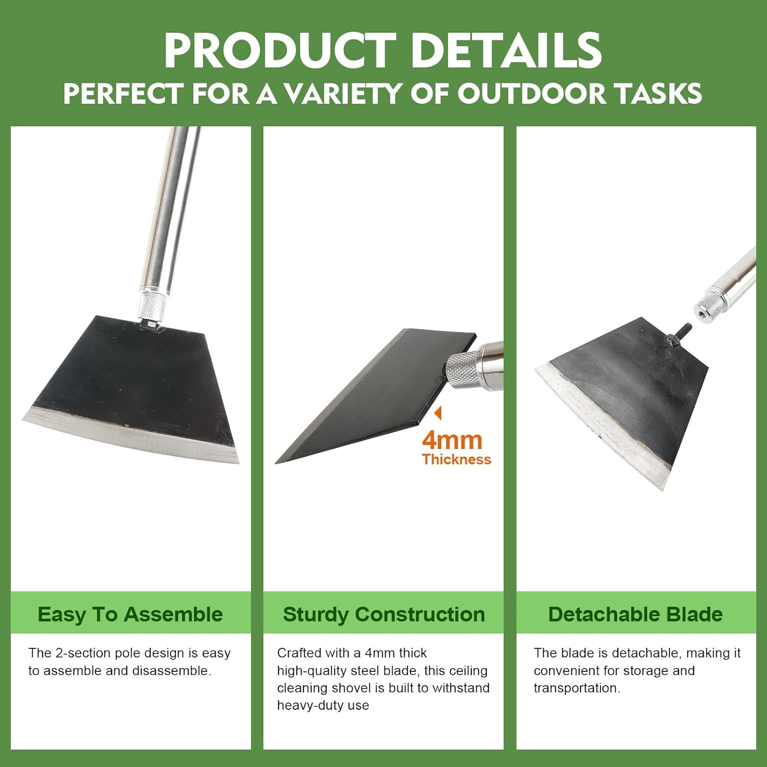 - Adjustable Long Handle for Comfort – With a two-section collapsible stainless steel handle, the Garden Shovel offers an adjustable length of up to 84 inches. The ergonomic design ensures comfort and easy maneuvering for users of all heights, making Weed Remove Tool suitable for long-term use without strain, providing comfort and safety for tasks like shoveling snow, gardening, or landscaping. Floor Scraper's long handle design allows for easier use without the need to bend down.