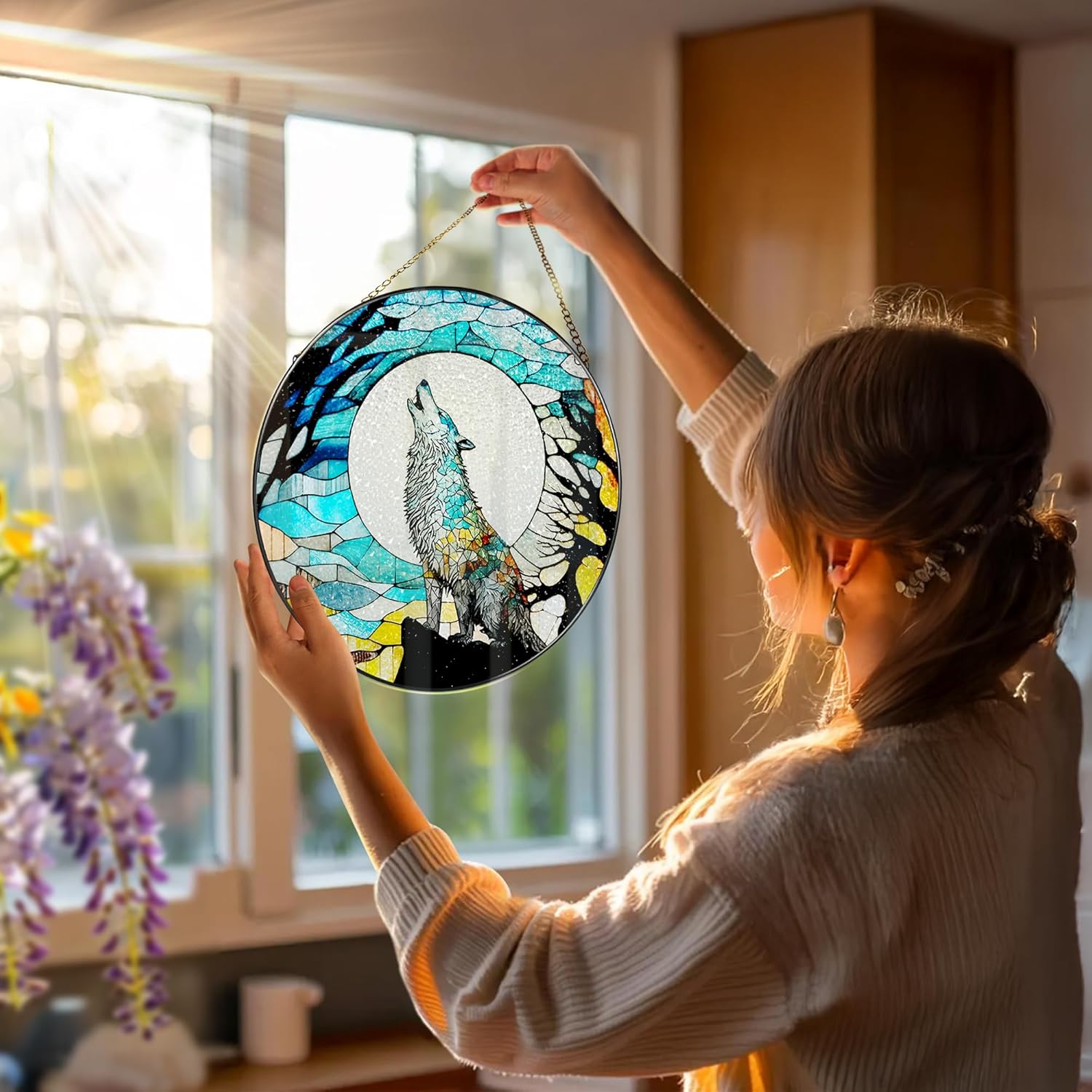 - Indoor/Outdoor Decoration: Stain glass window hanging can convert sunlight into vibrant colored light spots! Hang it on windows, walls, balconies, gardens, terraces, or porches, swaying with the gentle breeze and projecting light and shadow, instantly adding vitality, warmth, and artistic atmosphere to your home or outdoor space.