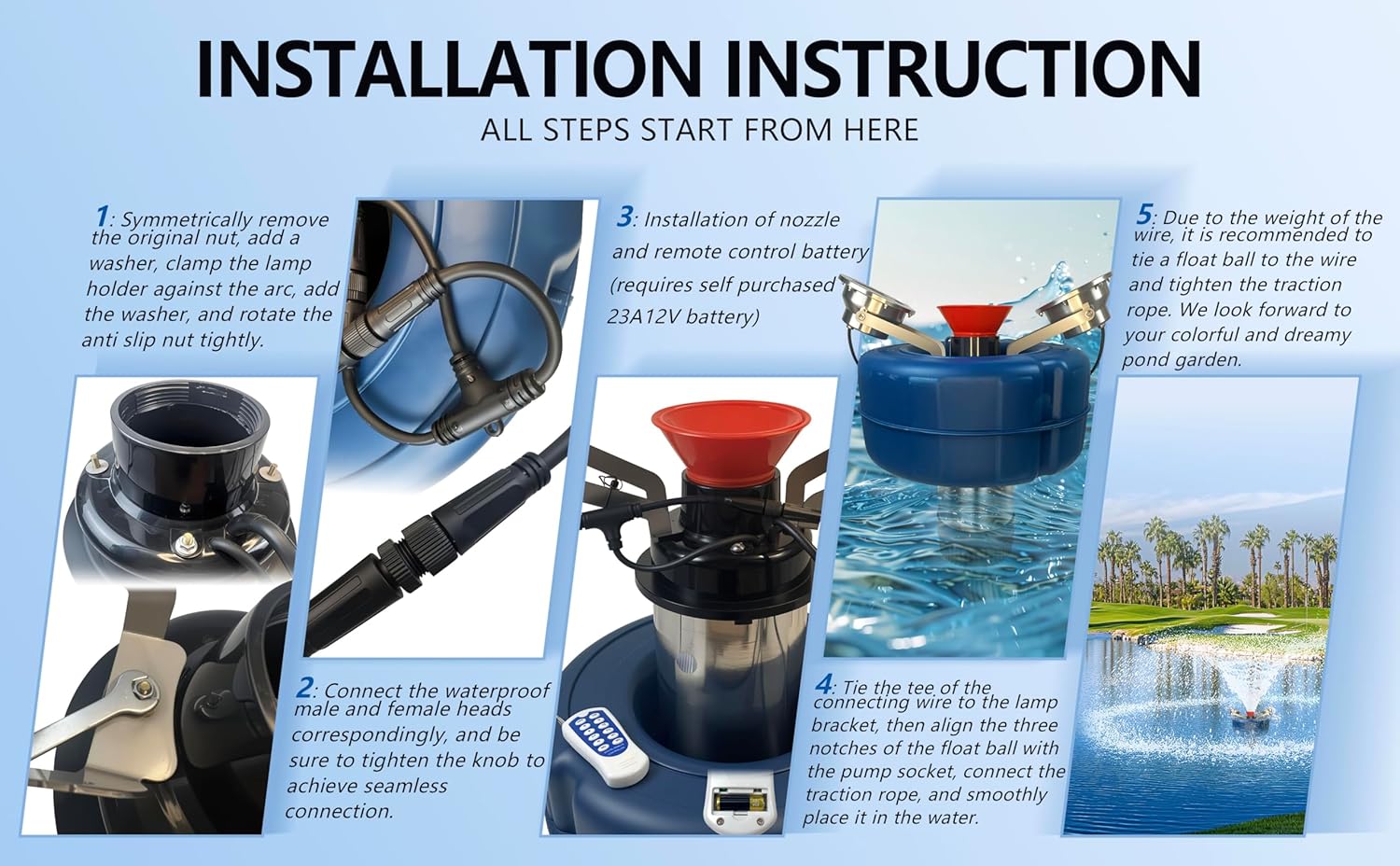 - To improve the light source effect: using 110V wireless remote control RGB rainbow fountain specific lights Large diameter 145mm, 12W12 LED beads. The remote control has 7 monochrome modes and 3 transformation modes to choose from.