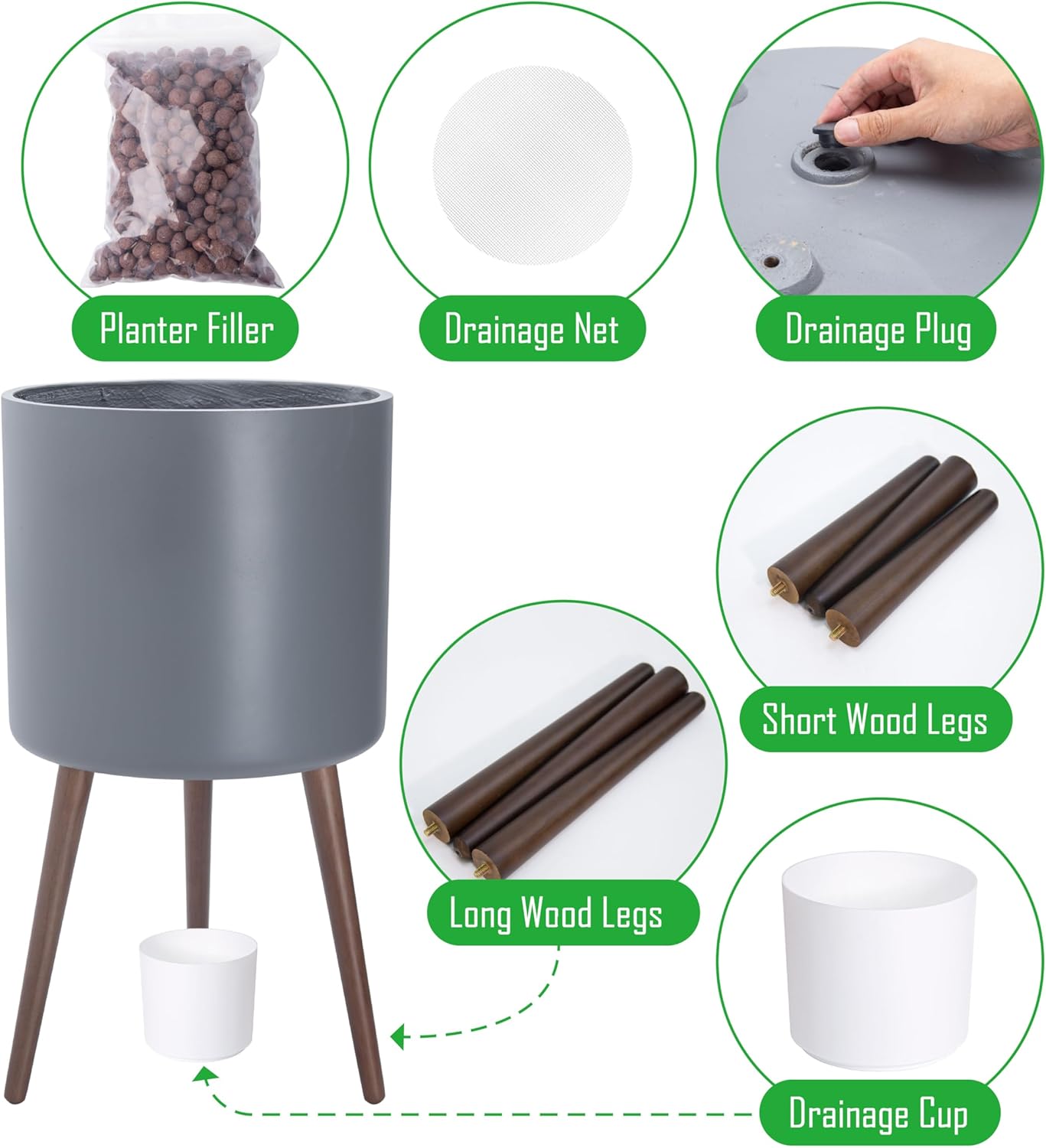 D'vine Dev 16 Inch Planter Pot with Stand, Mid-Century Tall Plant Pot with Legs for Indoor Plants, XX-Large, Grey, 88-O-E-3