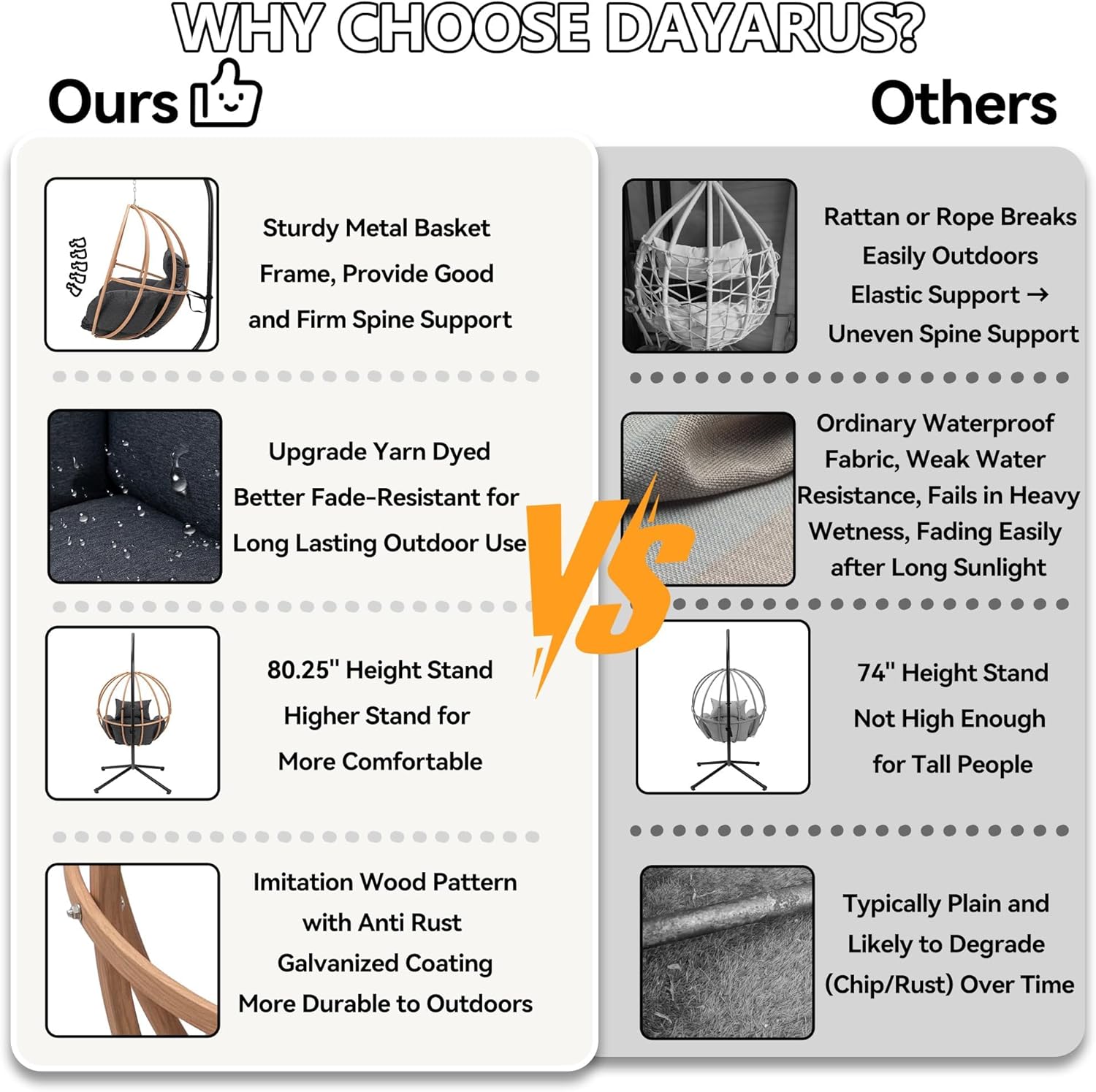 - Ultimate Comfort: This hanging egg swing chair features with a plush cushion and headrest, crafted from water and fade resistant yarn-dyed fabric, ensuring effortless relaxation in any weather