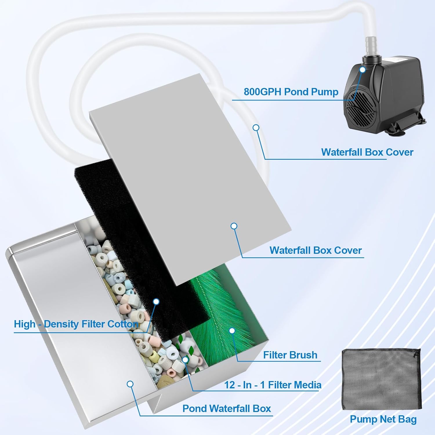 Pond Waterfall with Filter and Pump Kit, 304 Stainless Steel Waterfall Box for Ponds, 11.8in Spillway, 800 GPH Submersible Pump, 9.8' Hose, Sponge Filter, for Garden Pond, Water Feature, Aquaponics