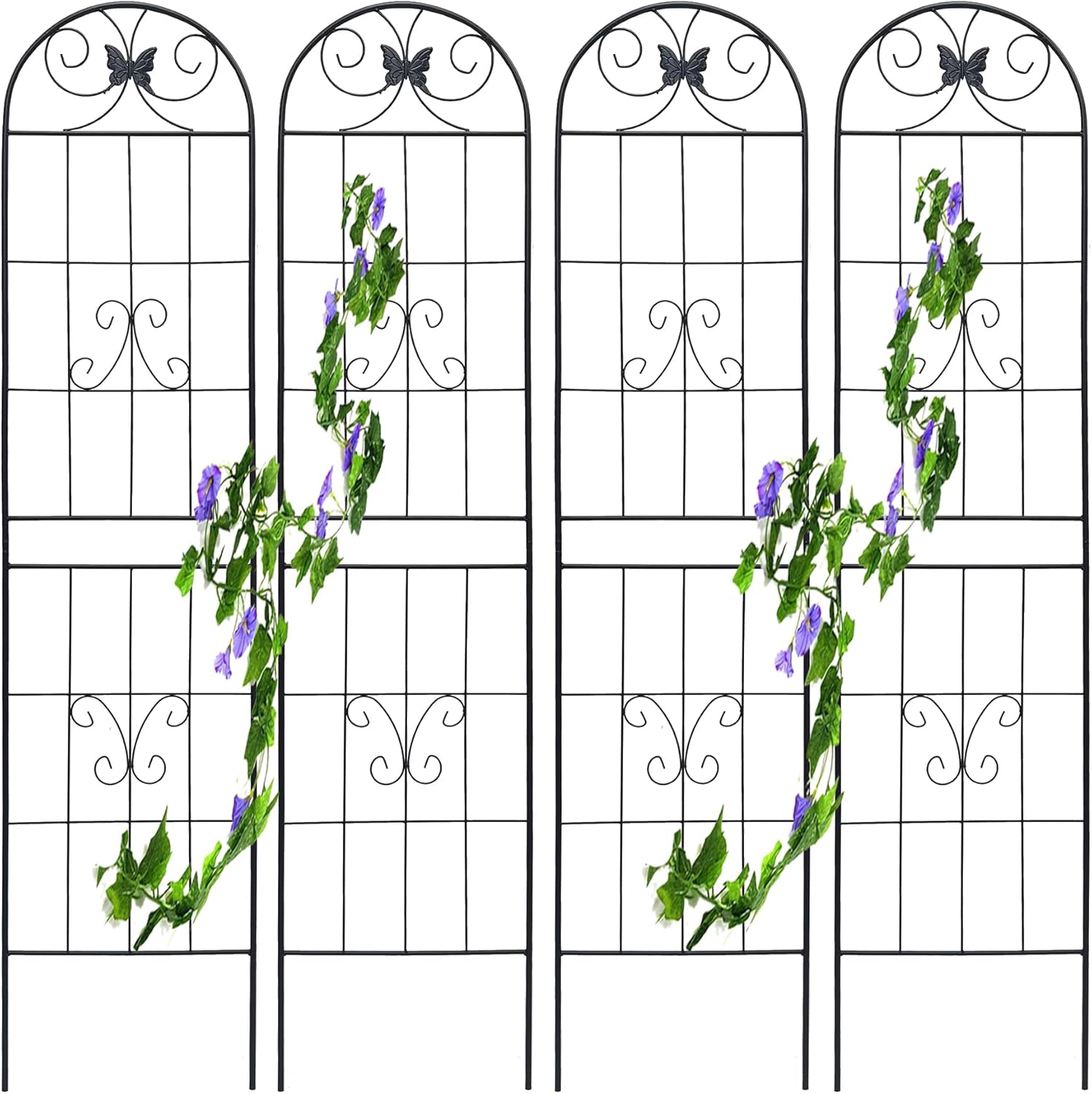 4 Pack Metal Garden Trellis for Climbing Plants, 86.7" Tall Rustproof Outdoor Trellis Panel with Line Butterfly Design, Decorative Black Iron Plant Support for Vine, Rose, Flower, Garden Wall