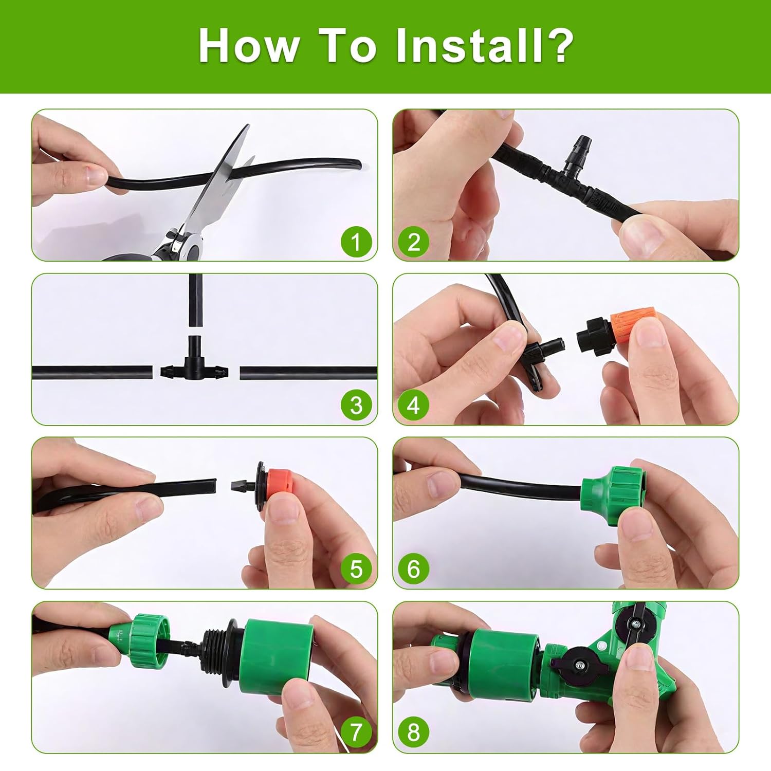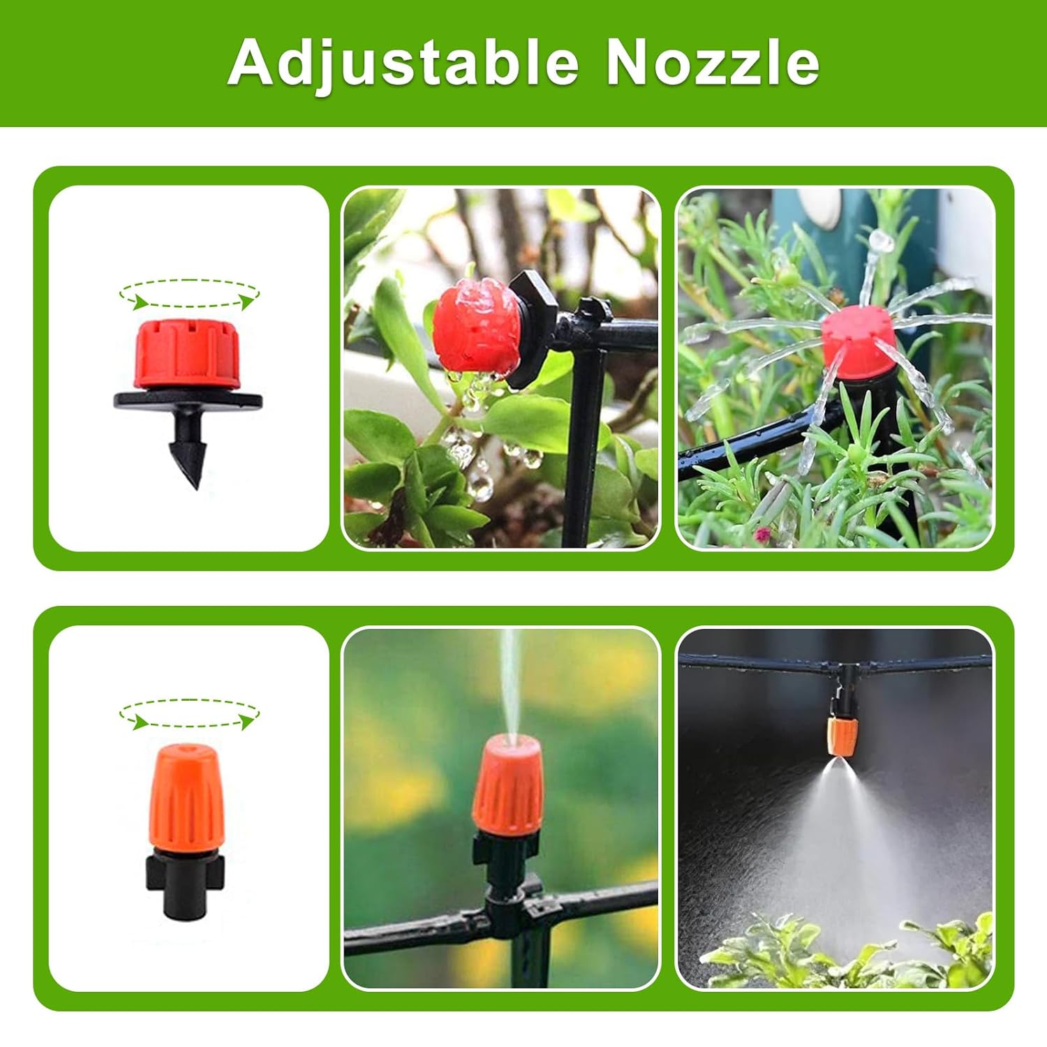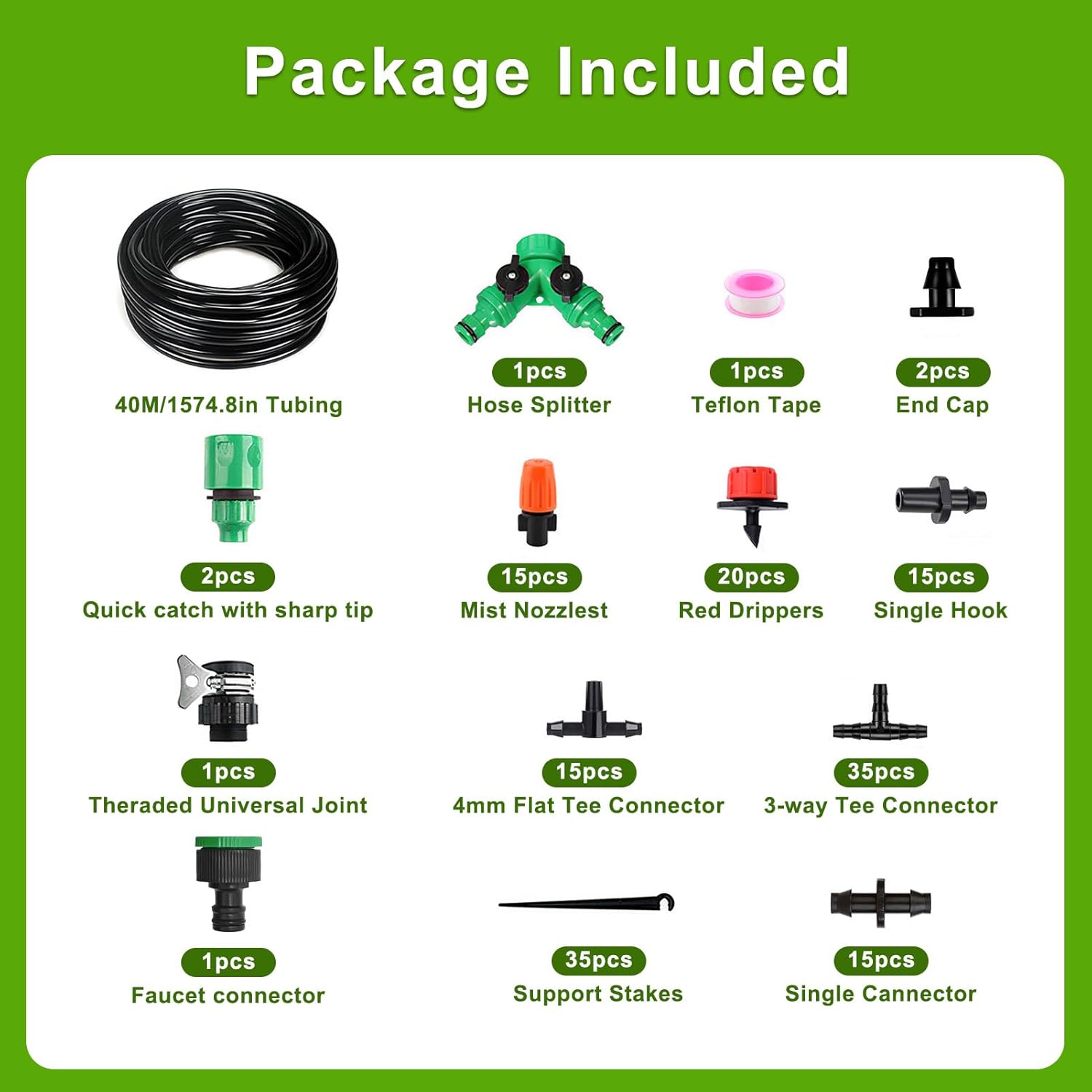 - ā [Complete Kit & Effortless DIY Setup] This 131FT drip irrigation kit includes 158 PCS (1/4" black tubing, quick connectors, adjustable nozzles, drippers, tees). Setup is a breeze! Simply connect components ā no digging or plumbing skills needed. Our pictorial manual guides you step-by-step.