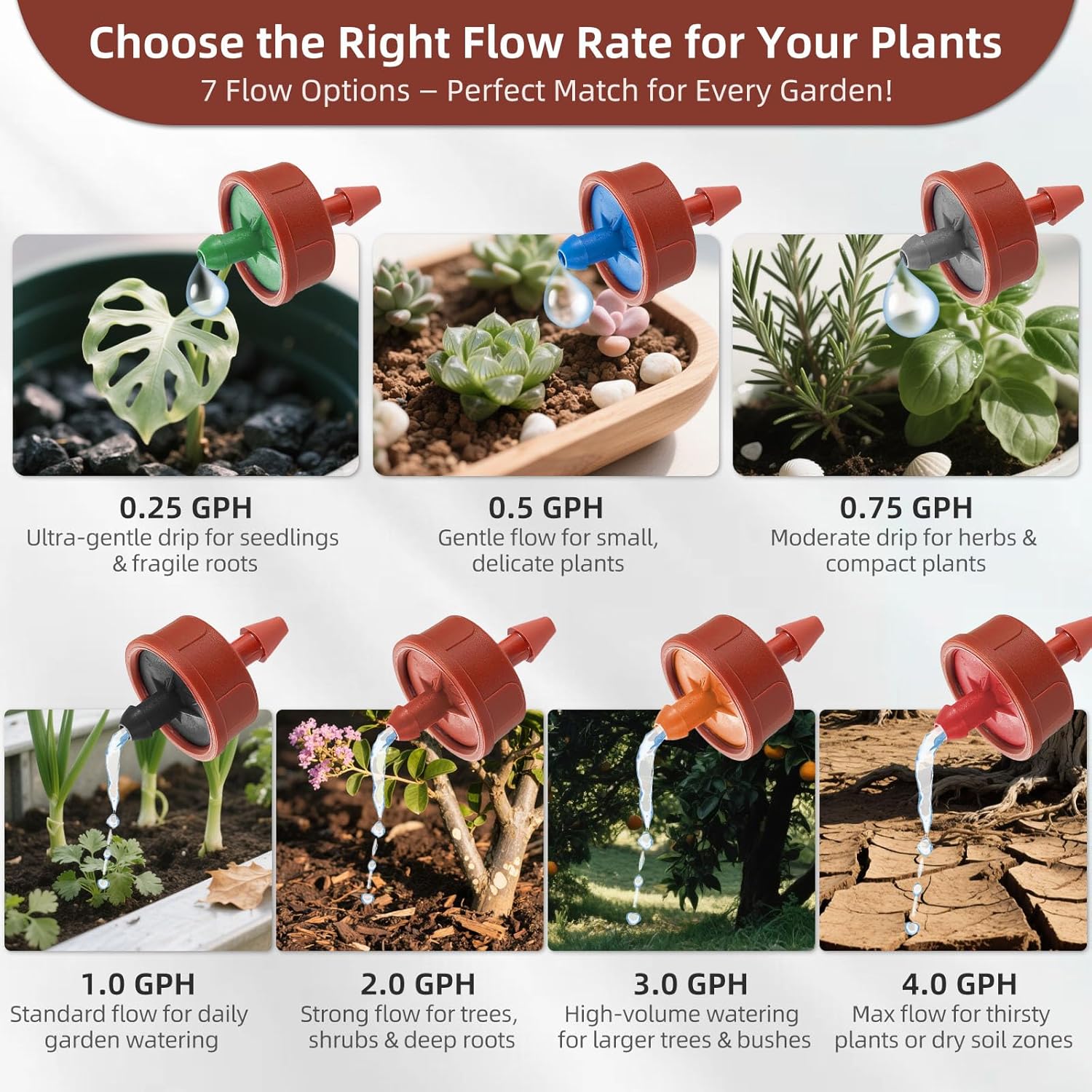 - Custom Flow Rates for Every Plant Type: Available in 0.25 GPH, 0.5 GPH, 0.75 GPH, 1 GPH, 2 GPH, 3 GPH and 4 GPH options. Choose low flow for delicate flowers, medium for vegetables, and higher flow for trees or shrubs. Optimize water delivery to each plant’s unique needs. !!! CHOOSE pressure-compensating drip irrigation emitters FROM 【Spalolen】!!!