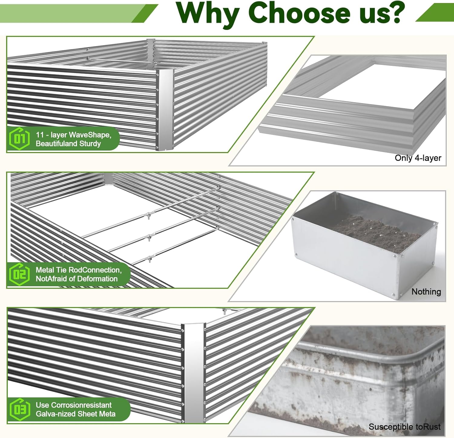 - 【Durable Galvanized Steel Construction】 Crafted from high-quality galvanized steel, this metal raised garden bed is designed for long-lasting use. The anti-corrosion coating ensures durability, while the sturdy frame withstands heavy soil and outdoor weather. Unlike traditional wooden beds, it won’t warp, rot, or crack over time.