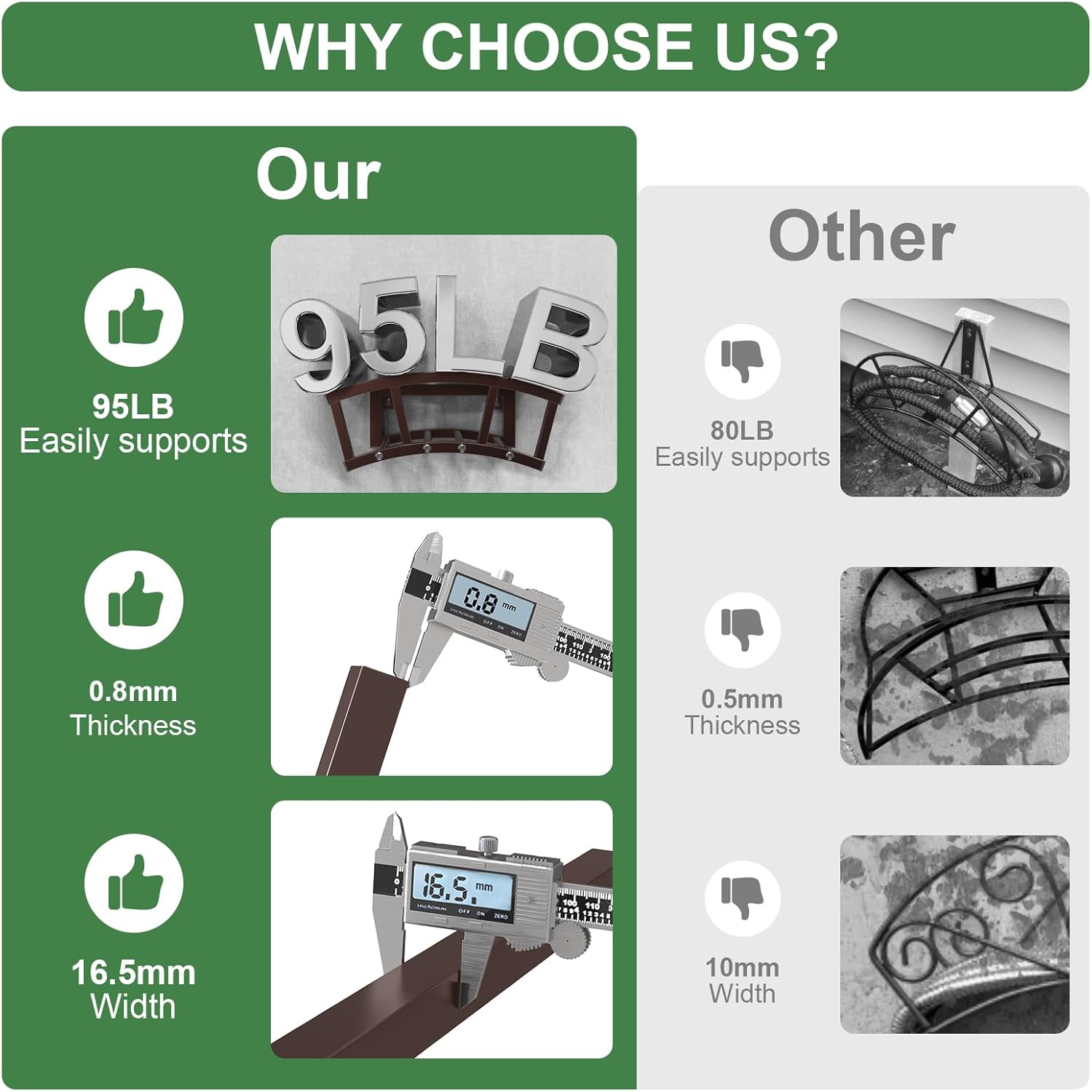 - [HEAVY DUTY HOSE HOLDER]:This garden hose holder wall mounted can hold up to 125 feet of hose. Gives strong reliability with up to 95 lbs of bearing weight. Our garden hose holder was made of high-strength and heavy-duty metal, 0.8mm thickness and 16.5mm width, other hose holder is 0.5mm thick and 10mm wide. So our hose rack is stronger that keep from bending and provide great load-bearing capacity