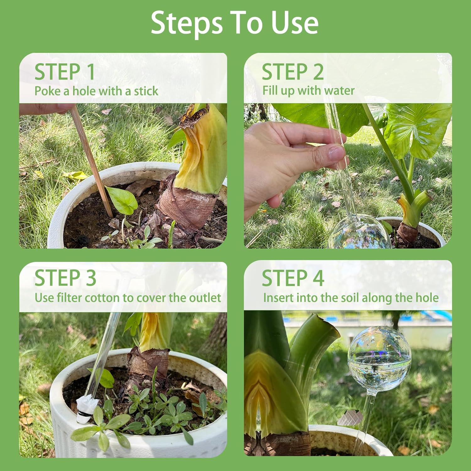 - [Easy to Use, Ready in Minutes] Filling these self watering globes is a breeze, and setup takes just 4 quick steps—no tricky instructions required. Just stick them in the soil, and they start working automatically. Even if you’re new to gardening, you’ll have no trouble with these. As reliable watering bulbs for outdoor plants, they’re perfect for watering plants while away—blending simplicity and functionality like a charm.