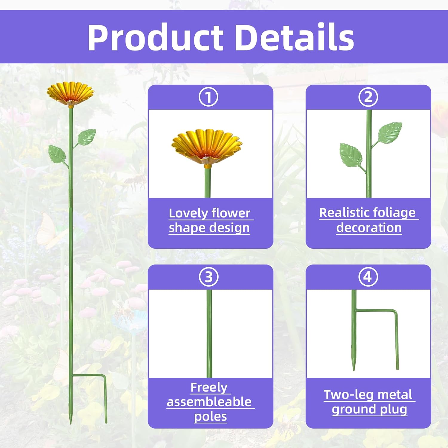 - Tool free installation: The flower stem and flower parts can be assembled without any tools, and the base can be inserted into the garden soil for successful installation. In addition, the pole diameter can determine the installation height on its own, creating a charming multi-level garden landscape.