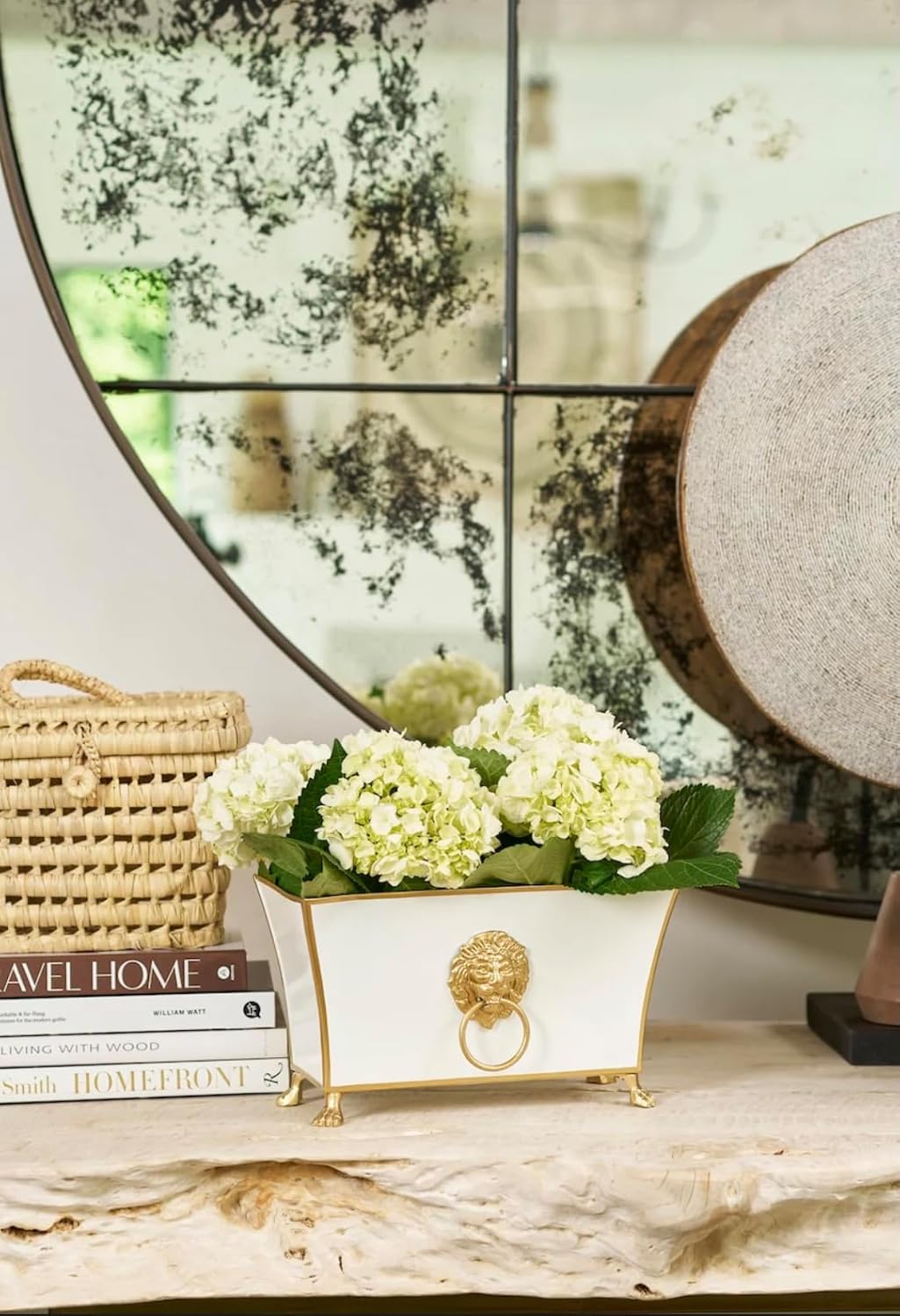 - Gracie Collection Signature Design | Featuring fluted edges and graceful feet, this cachepot from the Gracie collection offers unmatched sophistication in decorative boxes. Whether used on a console, windowsill, or dining table, this gold trim metal planter delivers style with purpose.