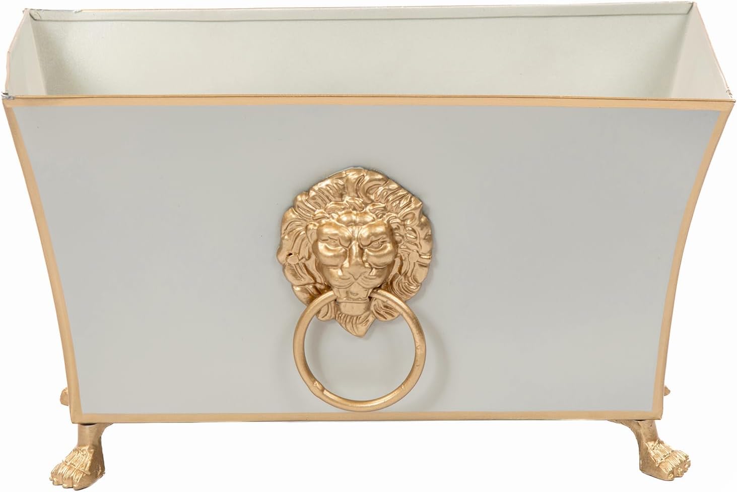 - Hand-Painted Metal Decor with Gold Detailing | This taupe metal decor piece is crafted from hand-painted metal and features decorative claw feet and a gold lion head ringโideal for enhancing planter decor on vanities or bookshelves.