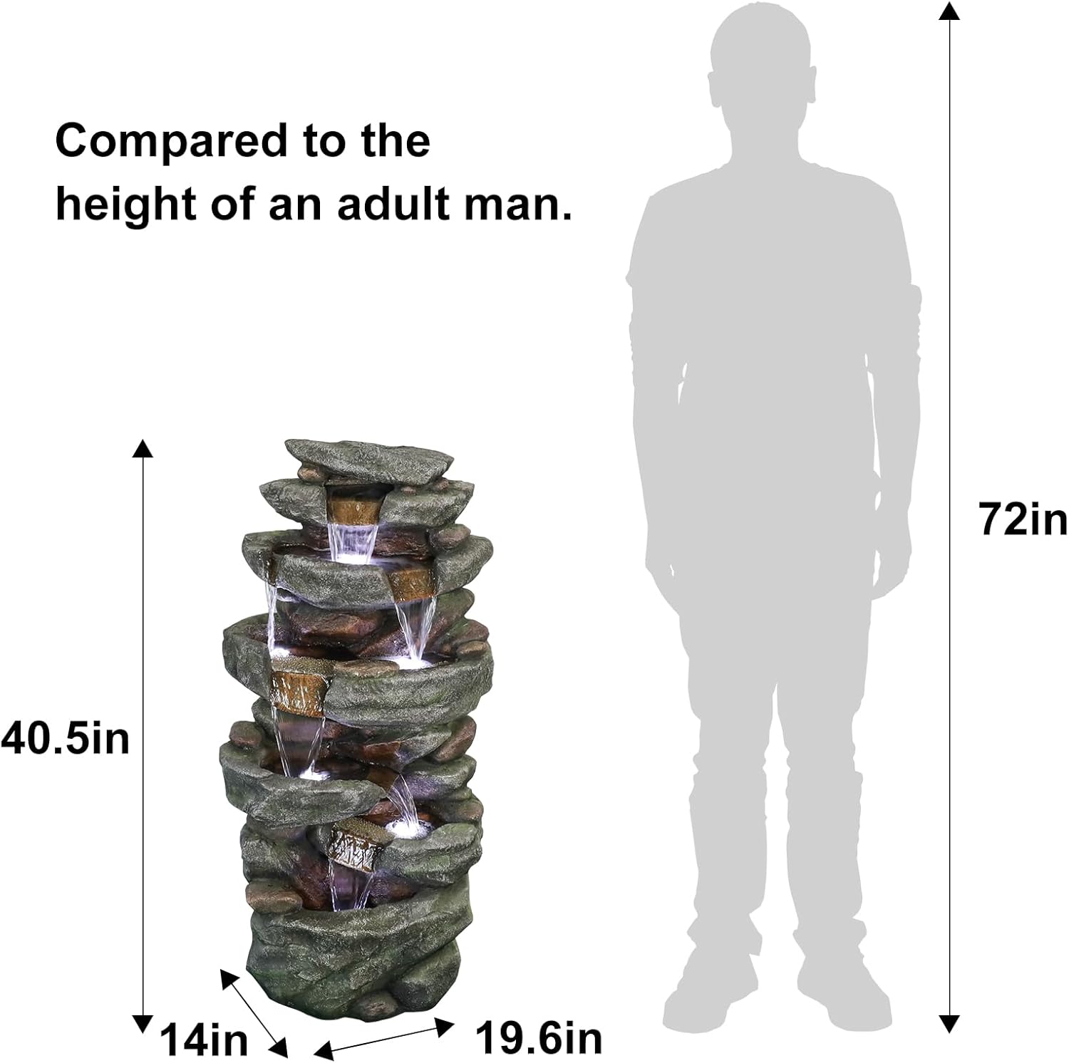 6-Tier Rockery Outdoor Fountain - 40.5”High Outdoor Waterfall Fountain with Lights for Home&Office Decor, Stacked Rock Cascading Relaxation Garden Features Outdoor for Patio, Yard, Deck