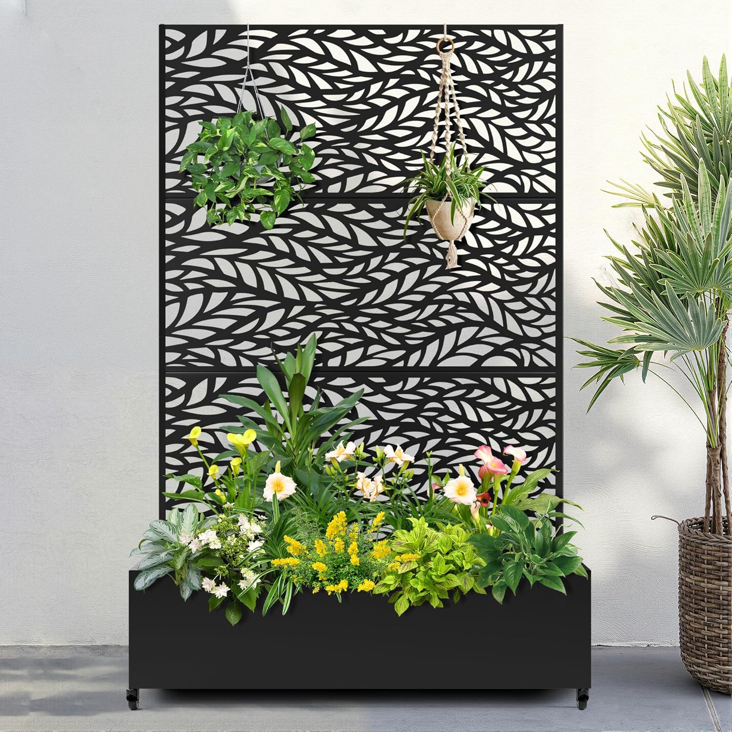 FENCY Metal Raised Garden Bed with Wheels and Trellis,73"x47"x16" Planter Box for Climbing Plants, Vegetables & Vines, Features Privacy Screen and Drainage Holes (Black-Leaf)