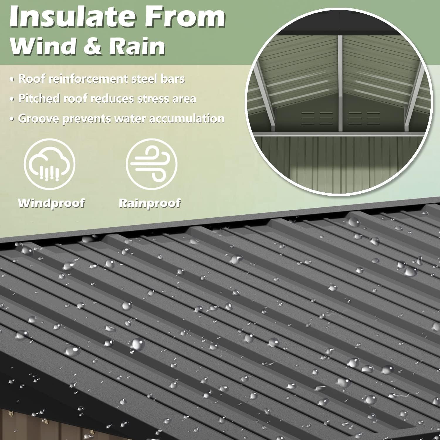- [Security and Durability] 3 beams roofs stay strong in wind and snow. The metal garden storage shed adopts electro-galvanized steel process and paint treatment, which is suitable for various climates, without worrying about the metal rusting, the all-metal storage shed will not be deformed by the sun, and has excellent moisture-proof performance.