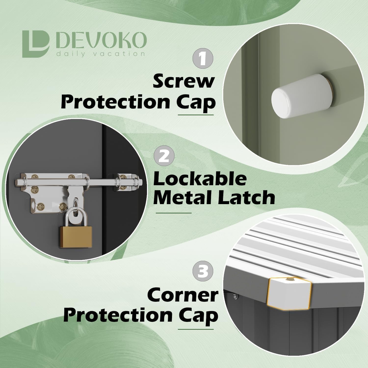 - [ Premium Durable Metal ]: Devoko storage shed is made of high-grade metal material, which has waterproof and UV-resistant properties. The thick material structure provides protection for the product's all-weather use, even in harsh weather conditions.