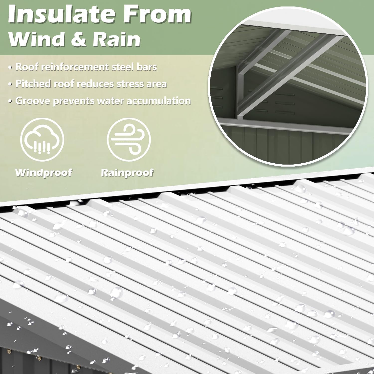 - [ Safety and Durability ]: Metal shed's pitched roof effectively prevents rainwater accumulation, while the equipped door lock ensures security. What's more, the equipped ventilation openings also allow for better air circulation.