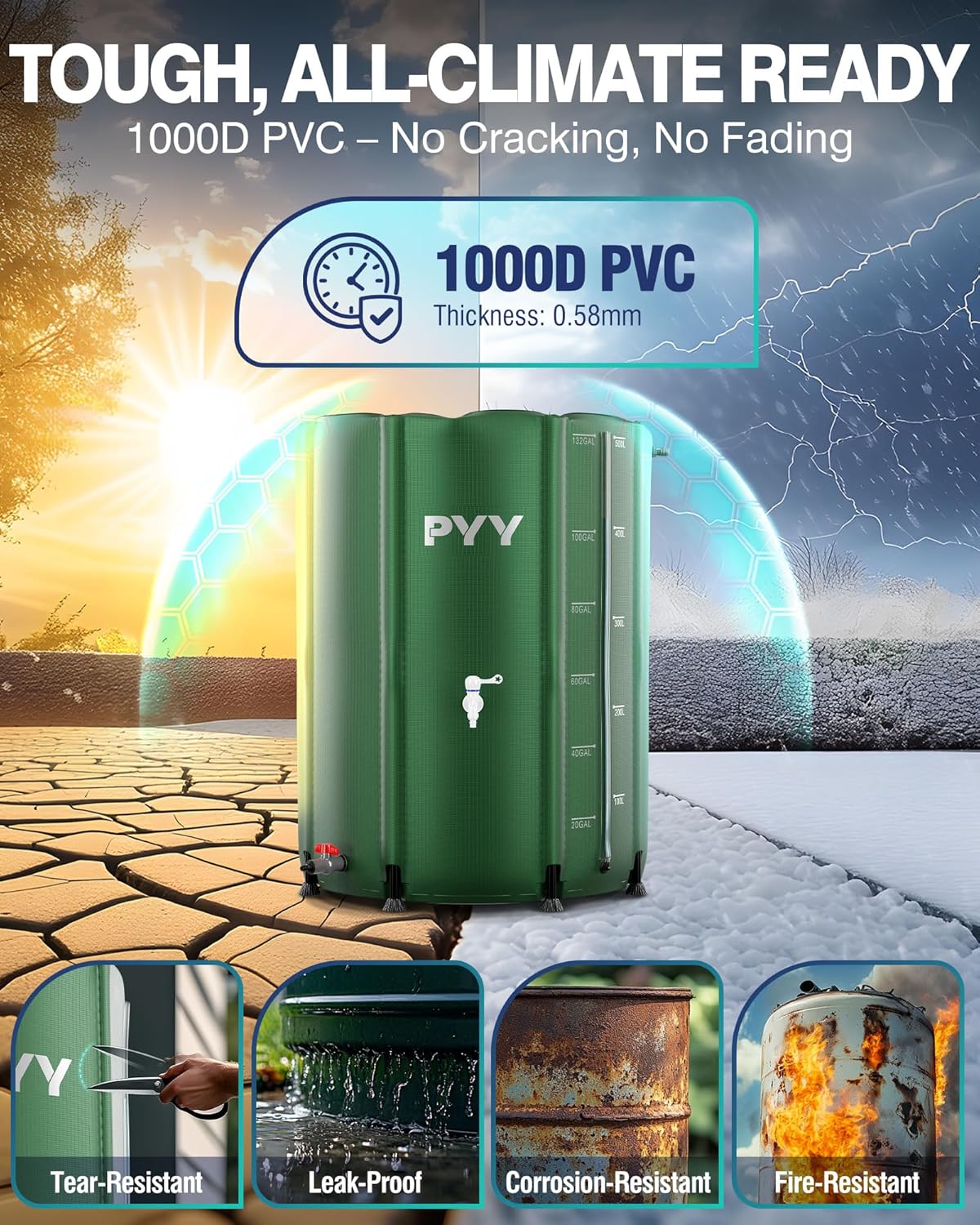 - šš®š«ššš„š & ššš®š«šš²: Our rainwater collection barrel is made from high quality 0.5mm thick 1000D PVC, lead-proof, corrosion-resistant, sun-resistant, and crack-resistant. Equipped with 6 robust legs of 1.5mm thickness, the rain storage barrel holds 100 gal water steadily. Enjoy the convenience of irrigation or cleaning in various areas, while our rain water catcher withstands the test of time.