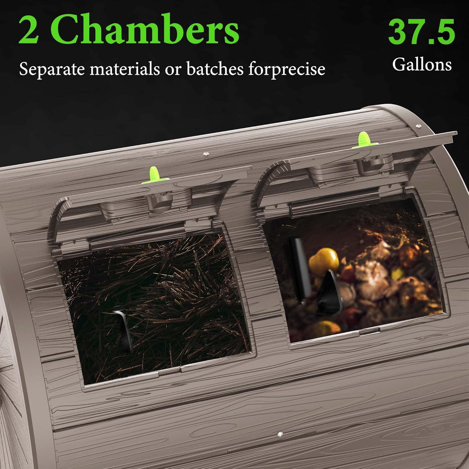 - Large Dual Chamber Design - Features a 37.5-gallon capacity with two independent chambers, allowing one side to complete composting while the other collects fresh scraps and yard waste. This alternating system ensures a continuous supply of nutrient-rich compost for your garden.
