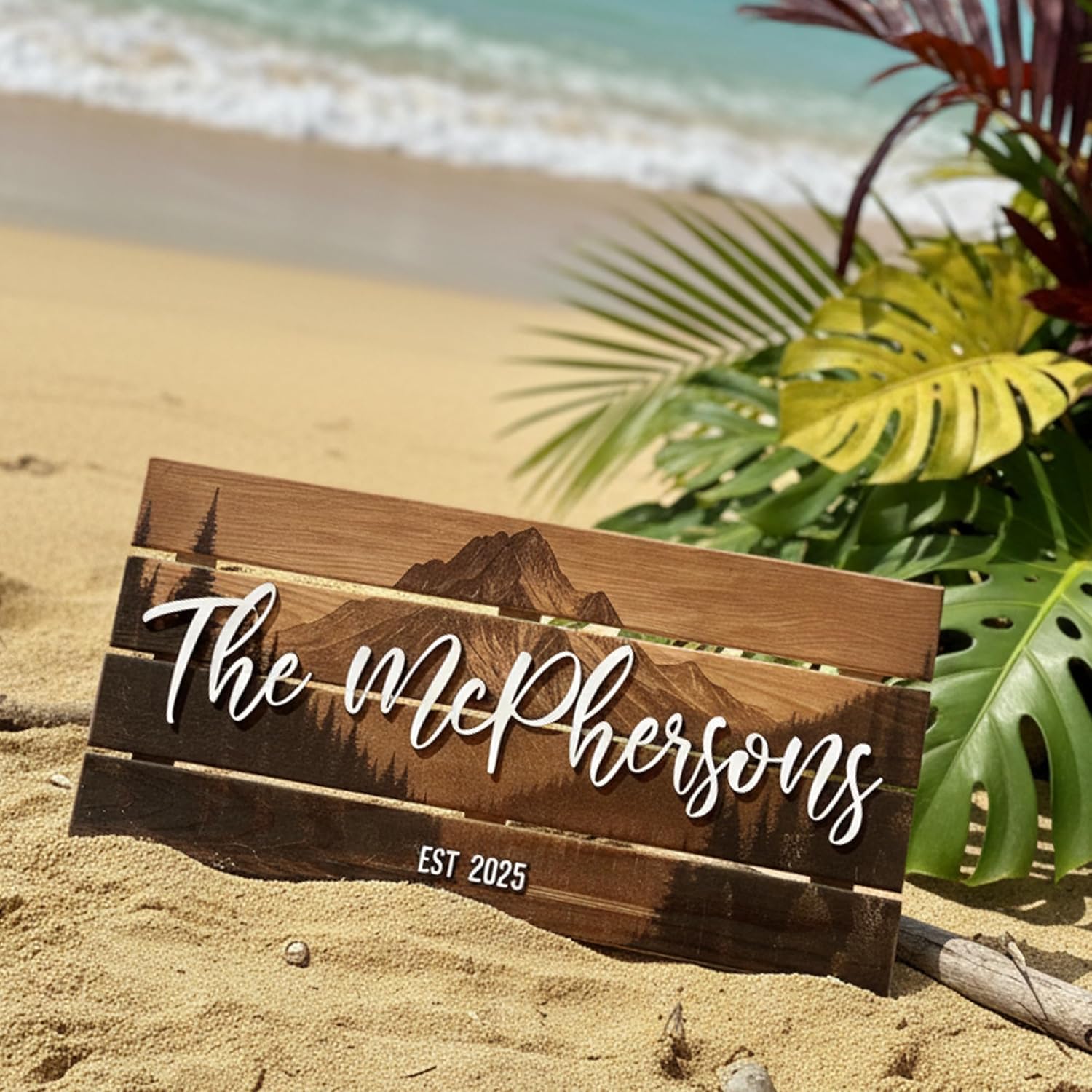 - Nature-Inspired Design: Features a unique, high-quality engraving of a mountain, forest, and lake landscape, adding a breathtaking and modern touch to the classic family name sign.