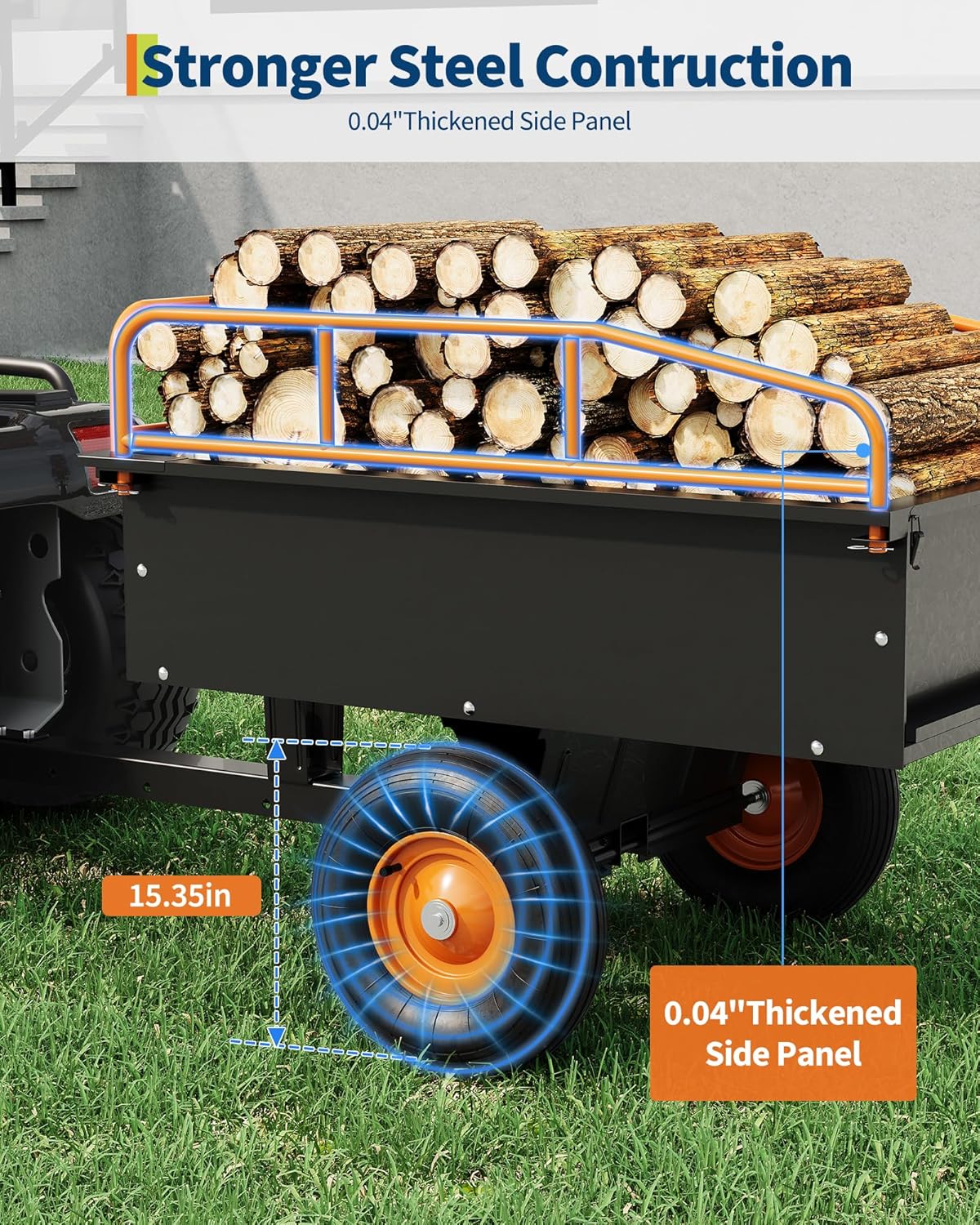 - 【High-Capacity Loading Design】:The Dump Cart is with 15 cu. ft. hauling volume which is ideal for transporting bulk materials (soil, mulch, waste) with fewer trips.Also three-sided steel railings prevent spillage while maximizing usable space.