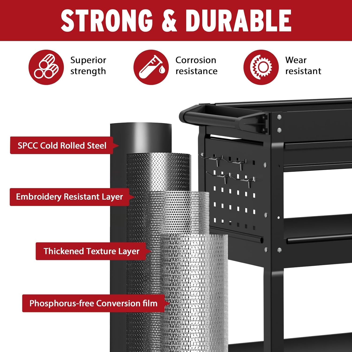 - Sturdy Construction: This tool cart with drawers is made of a high-quality cold-rolled steel plate with powder coated finished,which ensures its long-term use. Also its durable construction can withstand heavy loads.