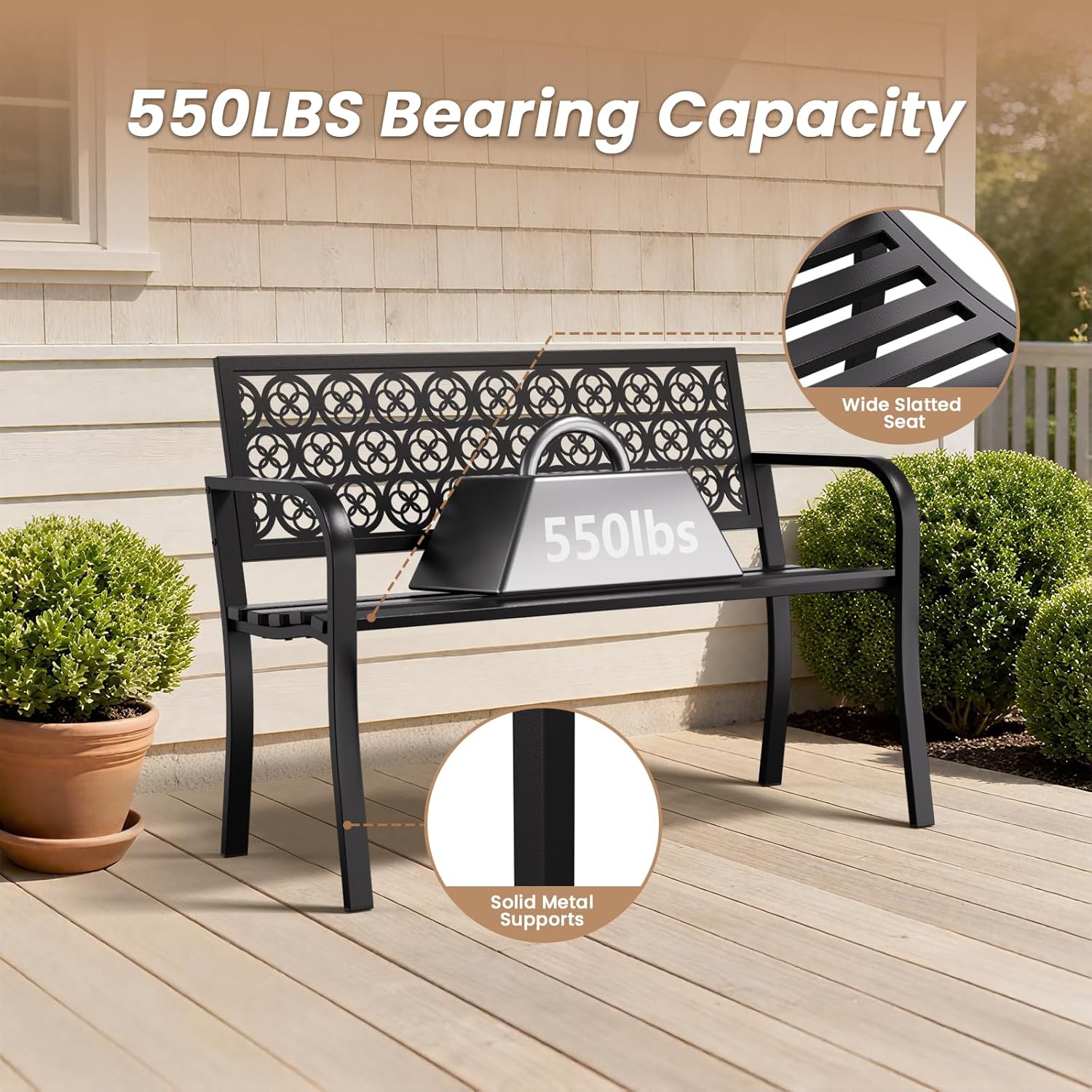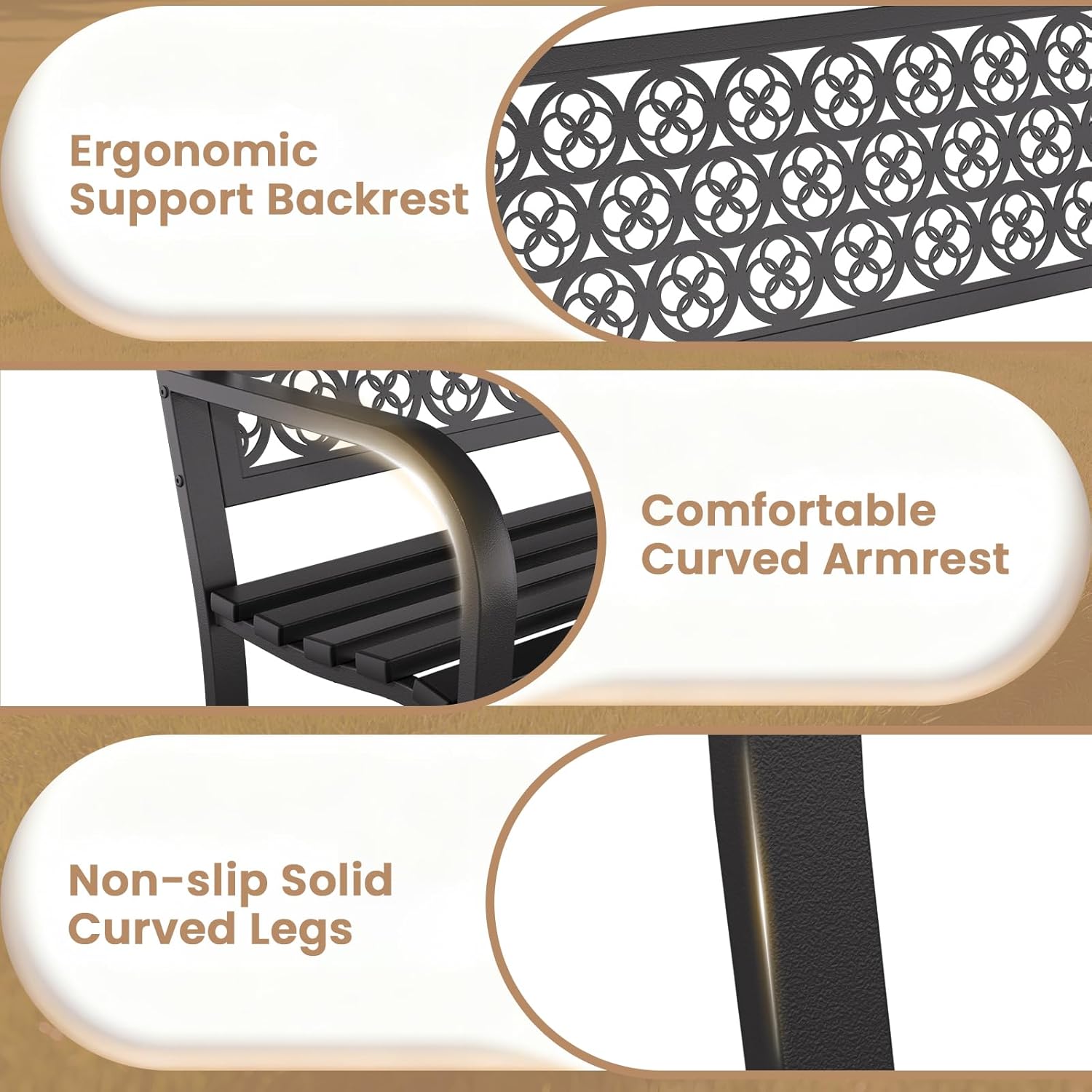 - 【Excellent Metal bench】Unlike fragile wood, this outdoor bench is made of reinforced iron which has excellent sturdiness and stability allow it to support 550lbs and use for years.The garden benches for outdoors applying to lots of areas, such as garden, park, patio, front porch, entryway.