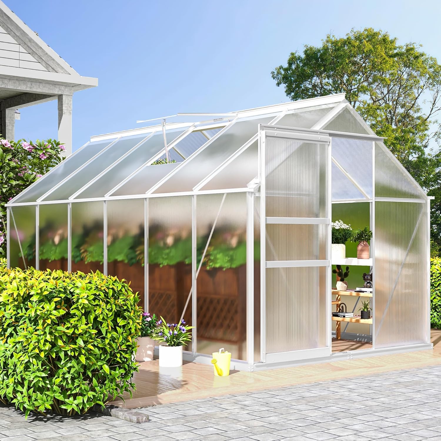 - ALL SEASON GREENHOUSE: Top tilt angle design of the polycarbonate aluminum greenhouse helps to achieve effective wind resistance and drainage capacity; This beautiful and convenient product is ideal for gardens, decks, and backyards for year-round plant cultivation and protection