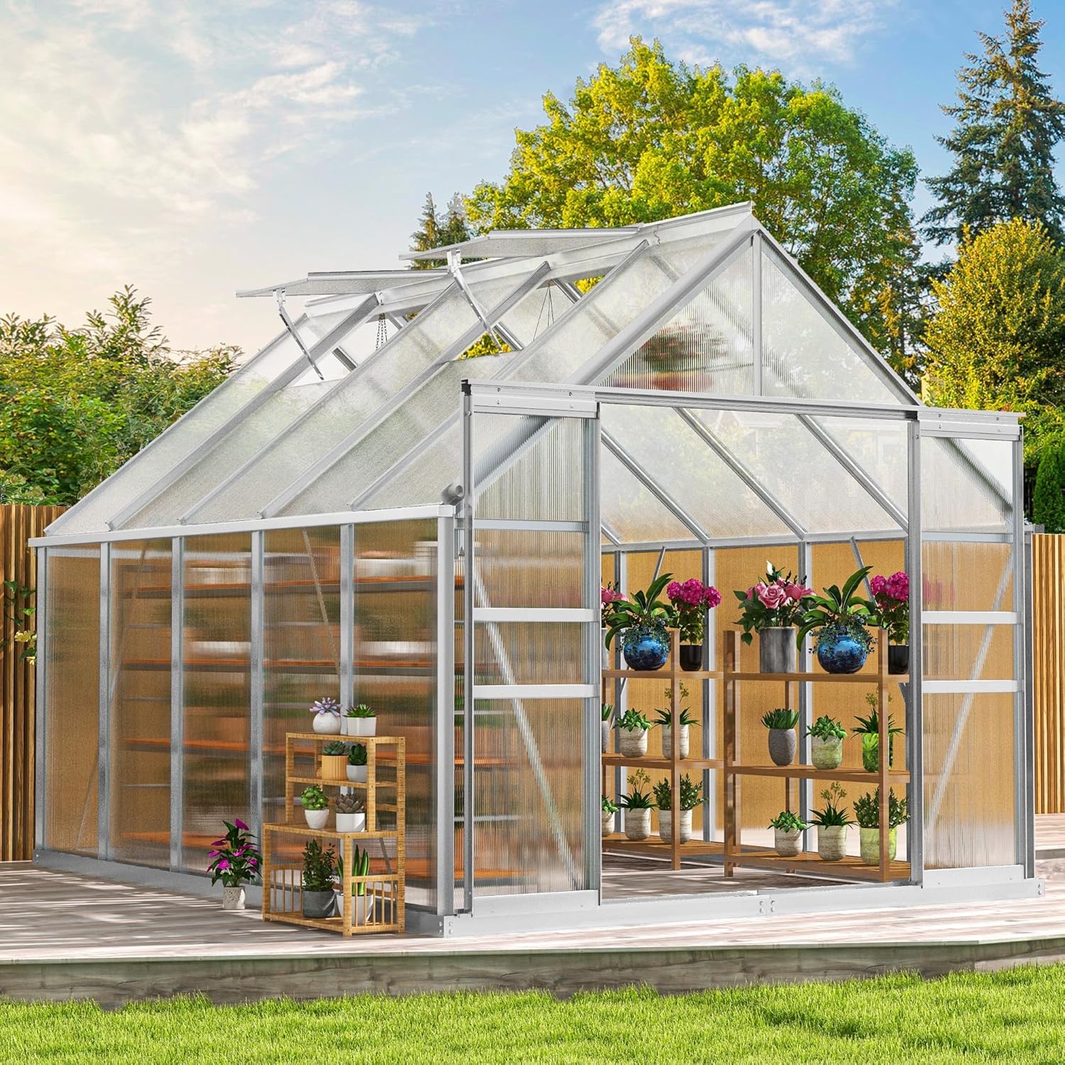- ALL SEASON GREENHOUSE: Top tilt angle design of the polycarbonate aluminum greenhouse helps to achieve effective wind resistance and drainage capacity; This beautiful and convenient product is good for gardens, decks, and backyards for year-round plant cultivation and protection
